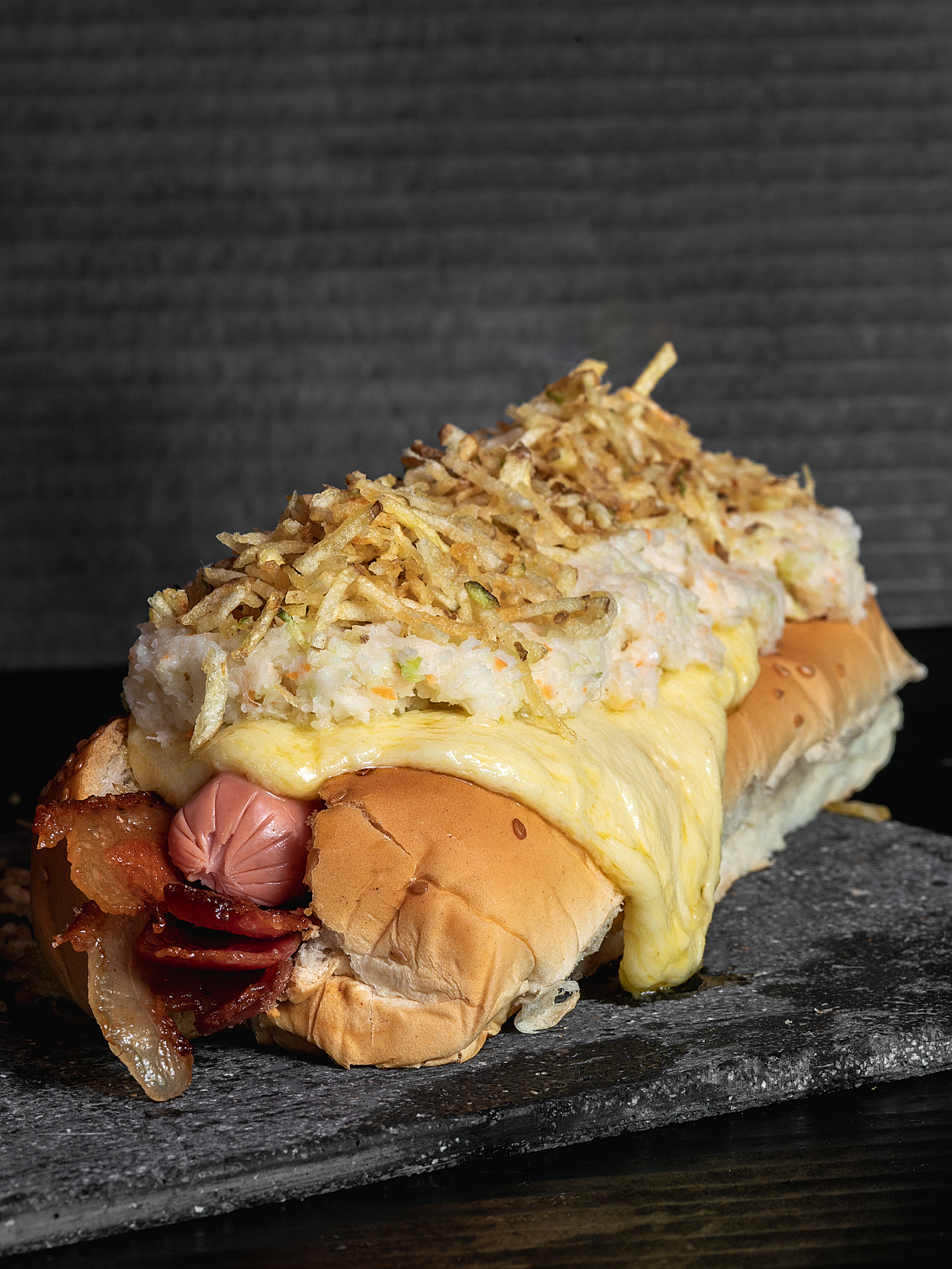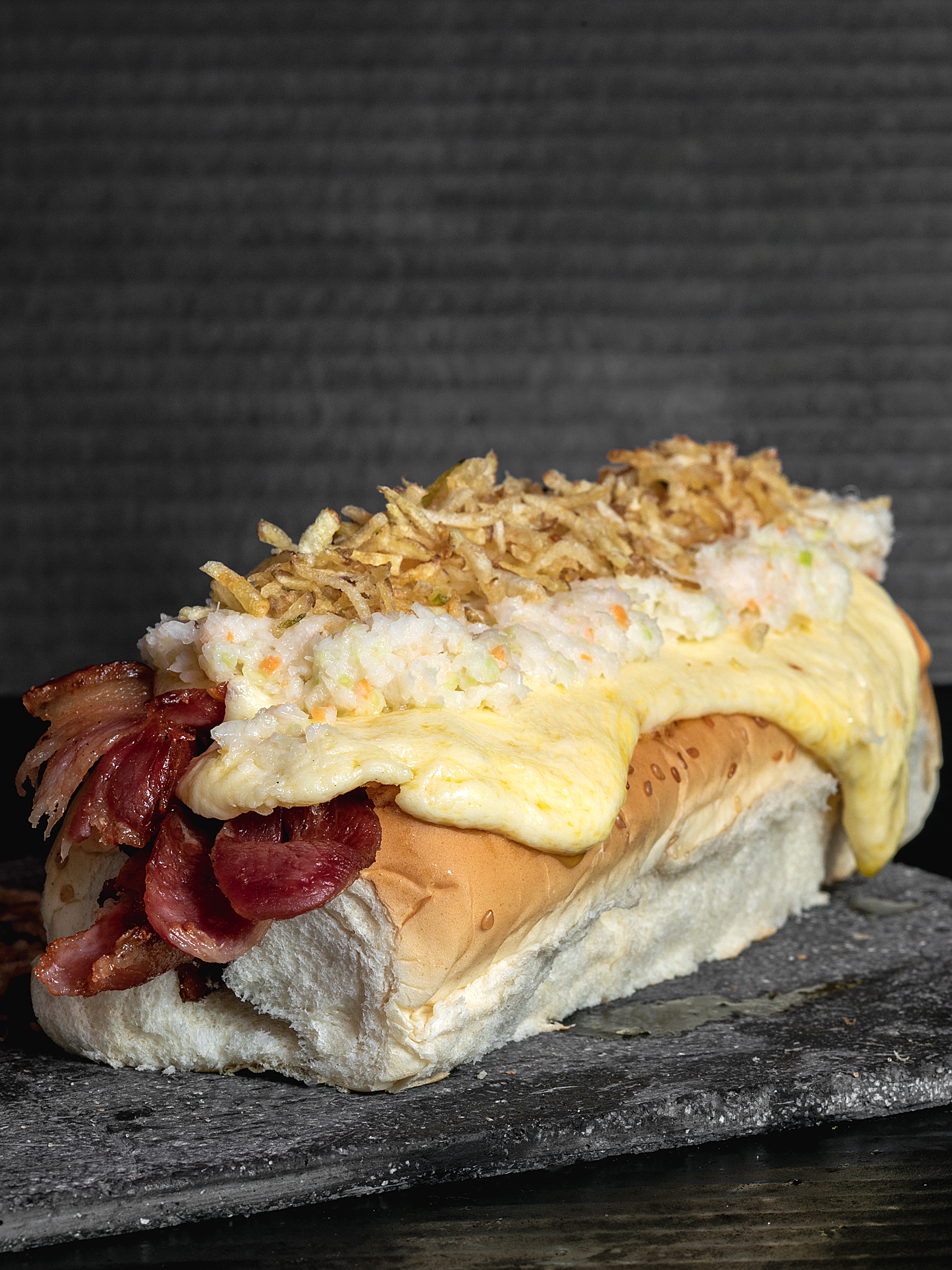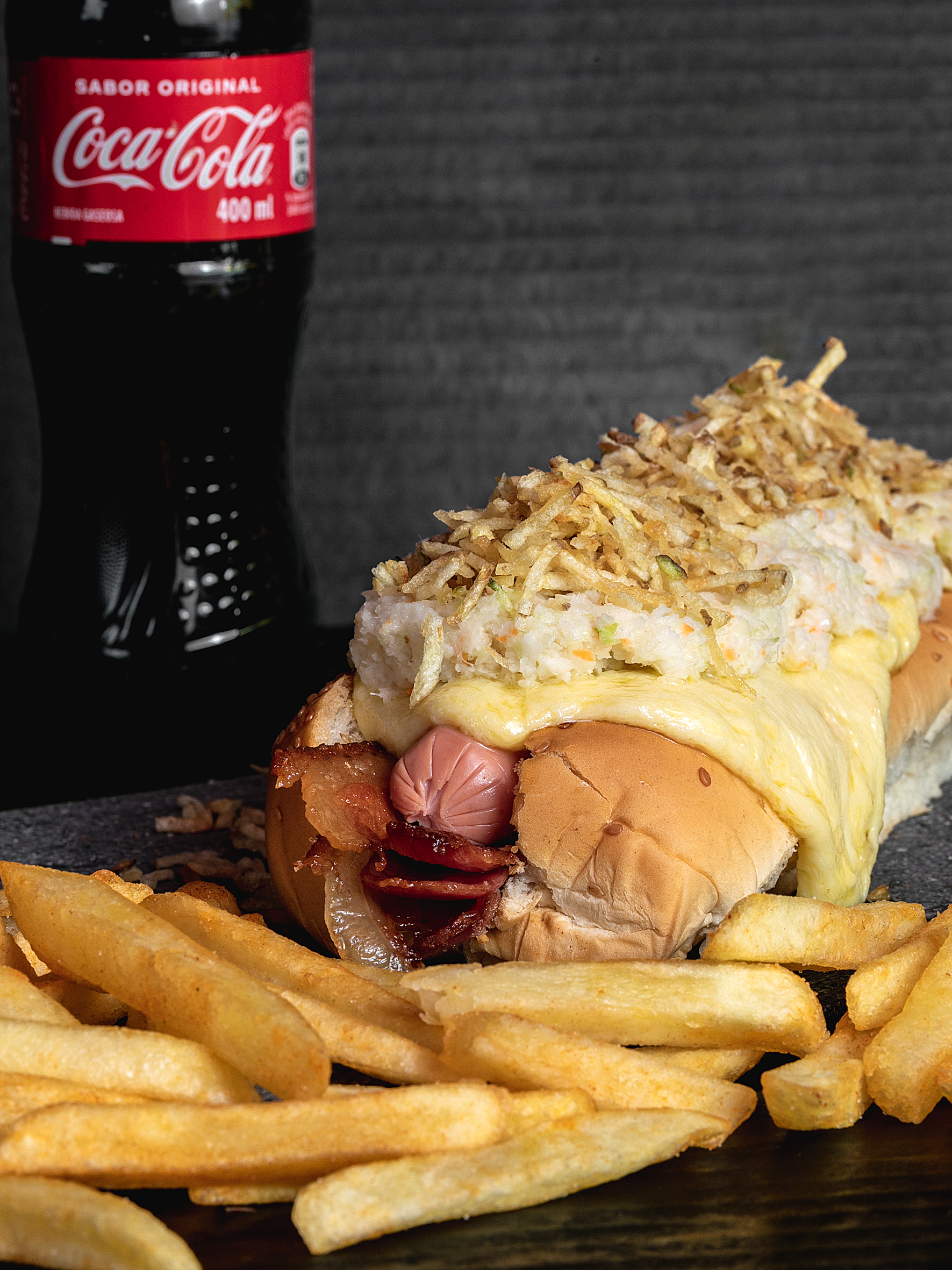 Pan grande, tocineta, queso, salchicha americana, ensalada de la casa, ripio de papa y salsas al gusto.