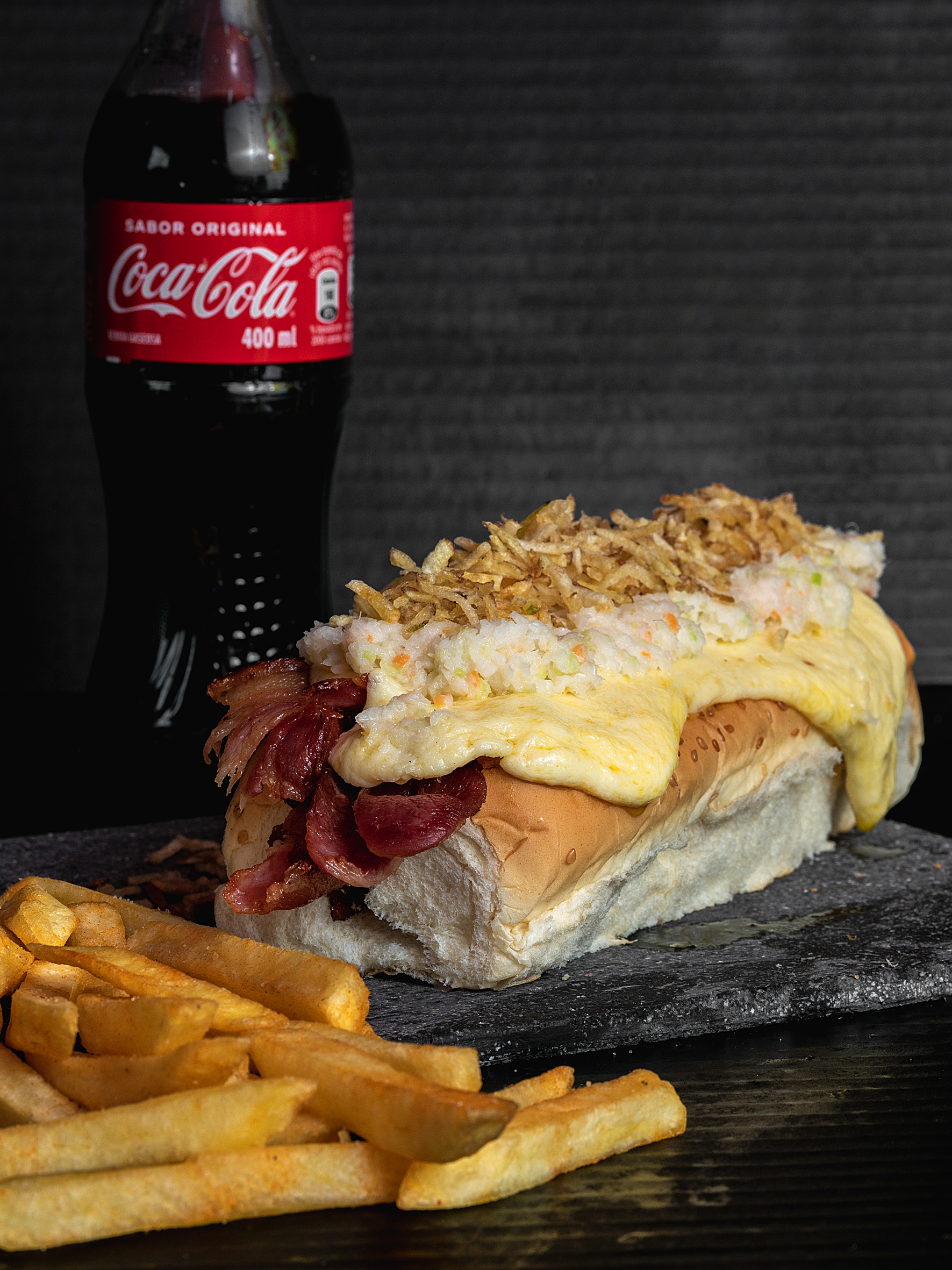 Pan grande, tocineta, queso, salchicha americana, ensalada de la casa, ripio de papa y salsas al gusto. + papas a la francesa + gaseosa