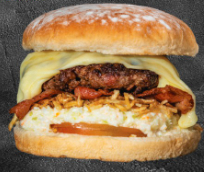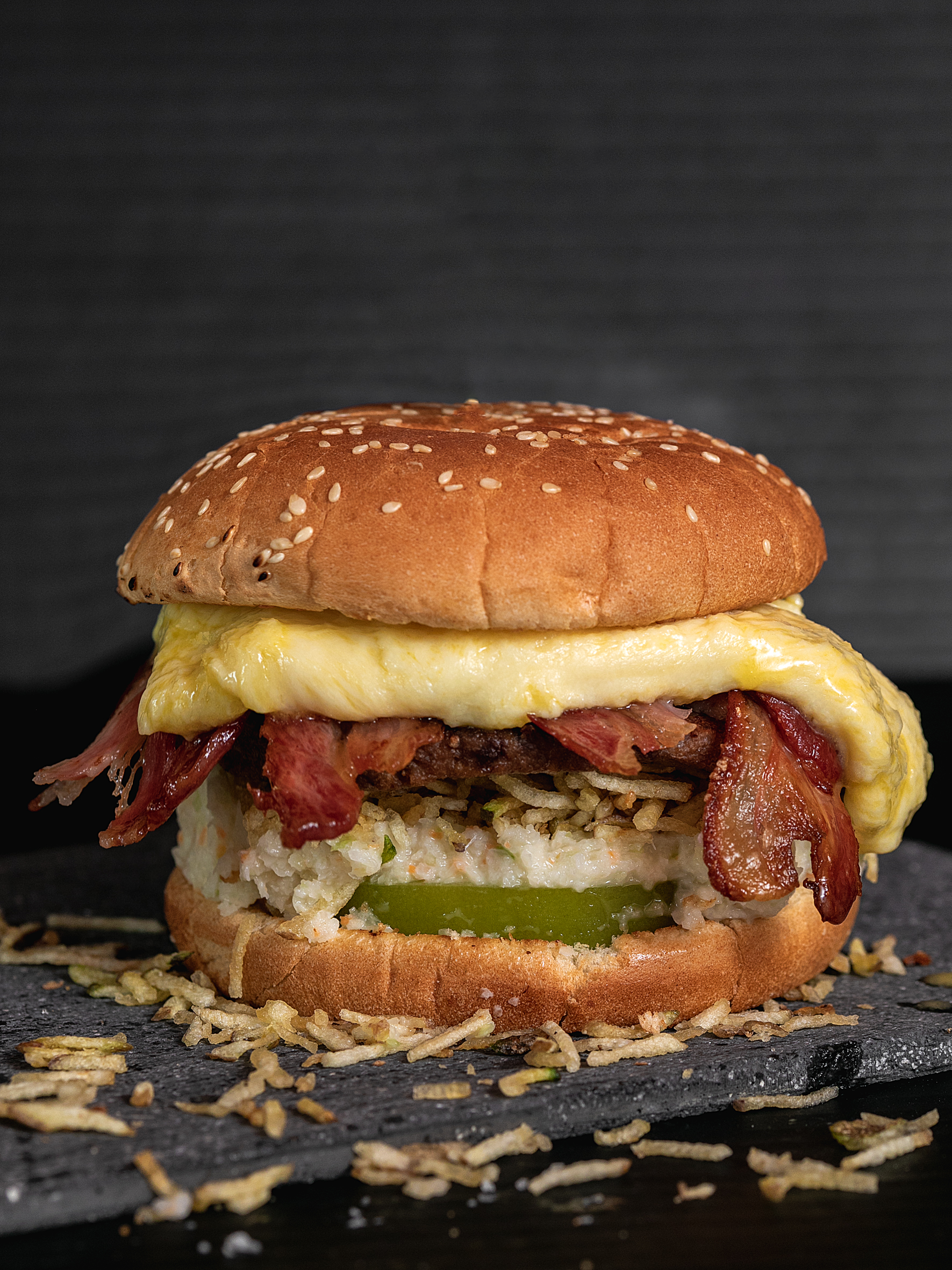 Pan, carne 100% artesanal, extra queso, extra tocineta, tomate, ensalada de la casa, ripio de papa y salsas al gusto.