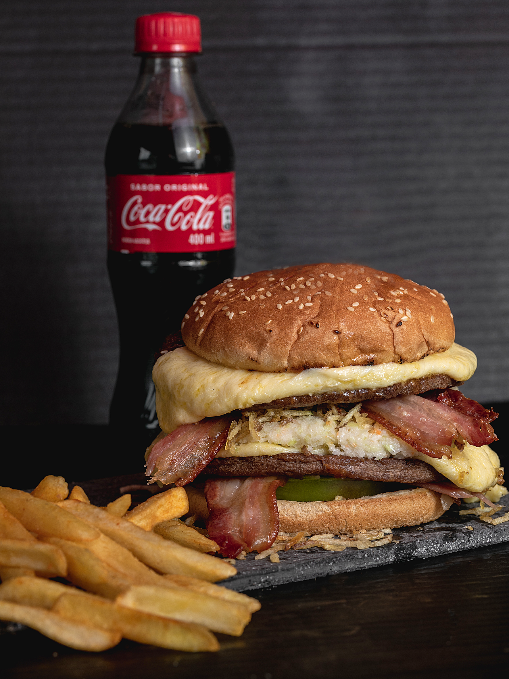Porcion personal: Pan grande (carne de res artesanal de 100 g aprox.), extra queso, extra tocineta, tomate, ensalada de la casa, ripio de papa y salsas al gusto. Acompañado de 150 g de papas a la francesa y gaseosa de 250 ml.