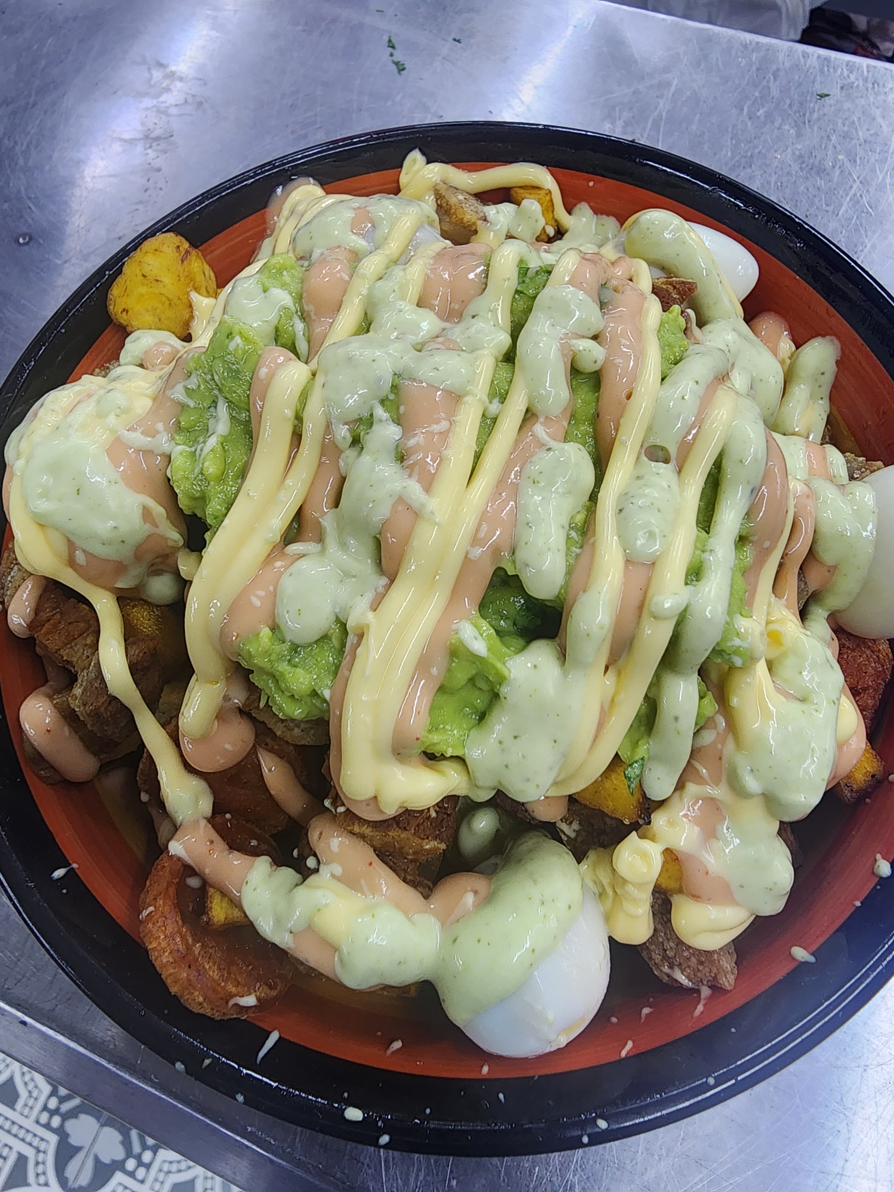 chicharron, chorizo, maduritos, queso mozarella, guacamole, huevos de codorniz y super papas