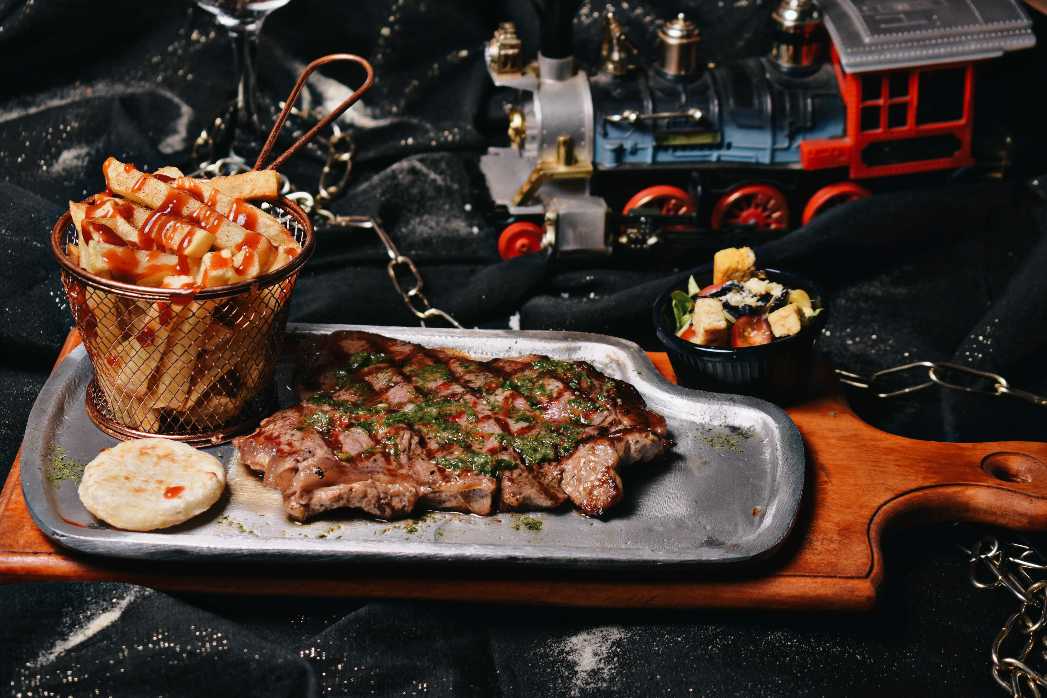 Solomito madurado a término al gusto, con chimichurri, papas a la francesa, arepa y ensalada de la casa. Guarnición a elegir.