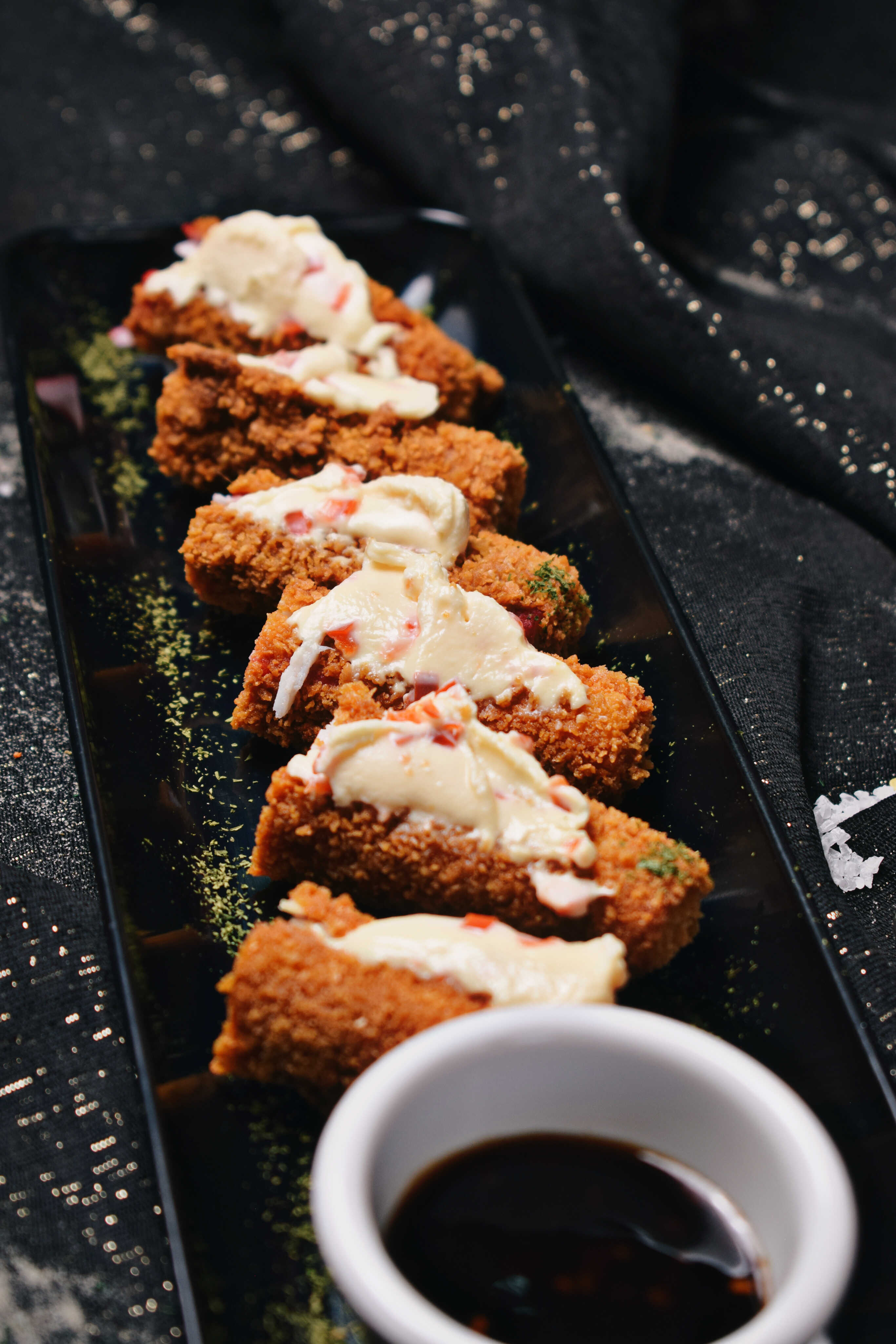 Palmitos apanados con queso crema de pimentón y salsa teriyaki.