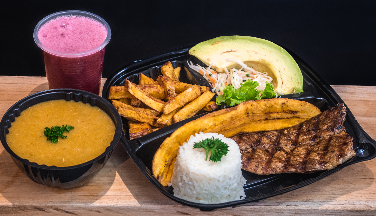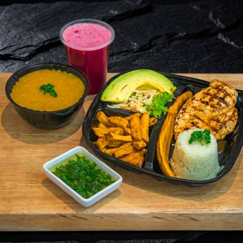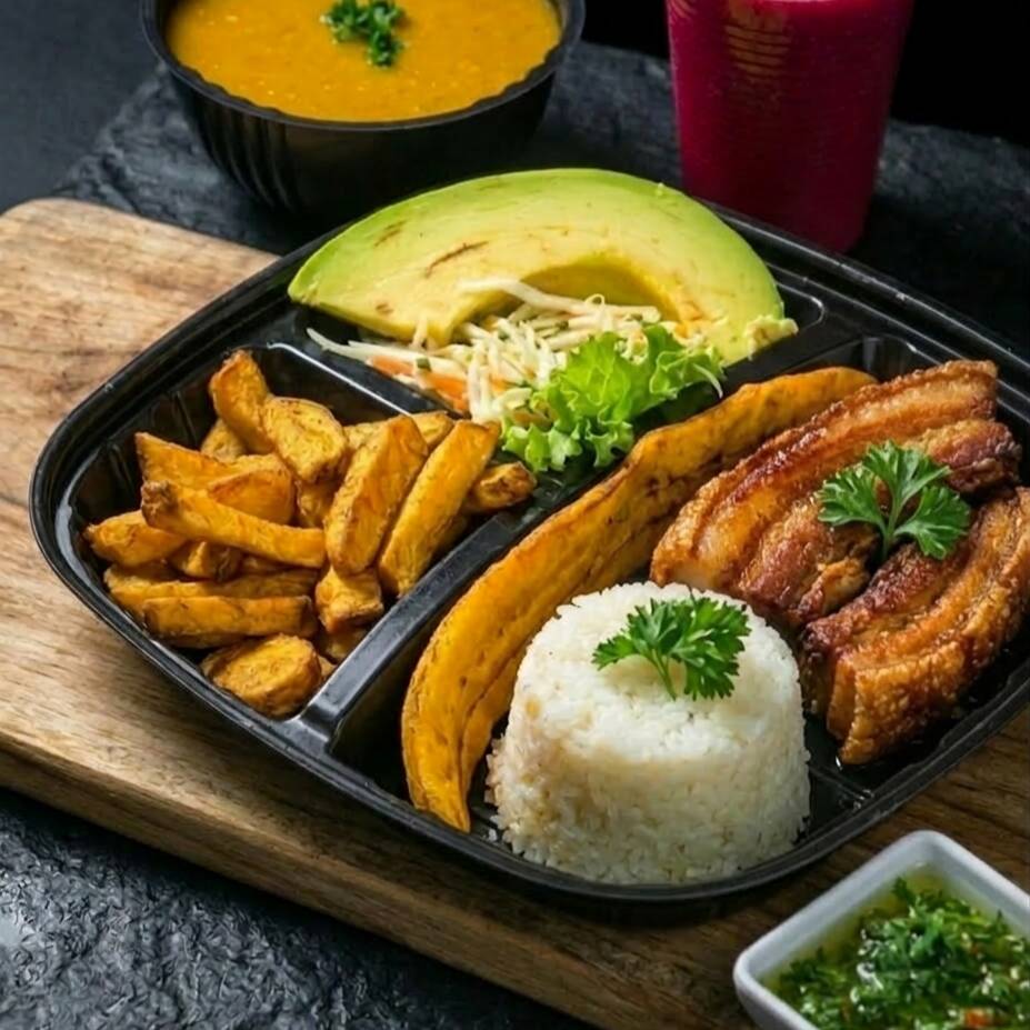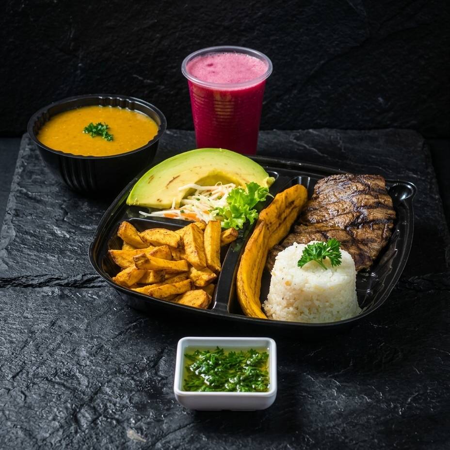 Elección entre frijol, sopa del día o crema; acompañantes: arroz, arepa, ensalada, madurito, aguacate, papas al vapor o francesas y proteína.