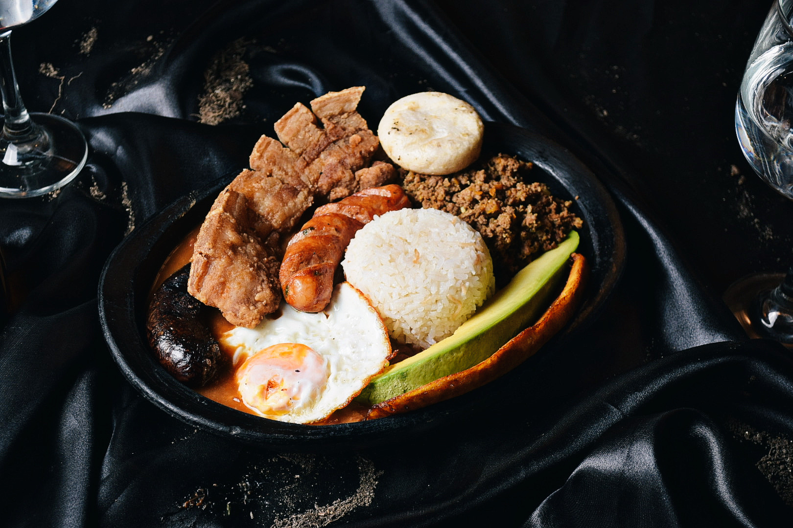 Frijol, arroz, chicharrón, chorizo, morcilla, carne molida, huevo, maduro, aguacate y arepa.