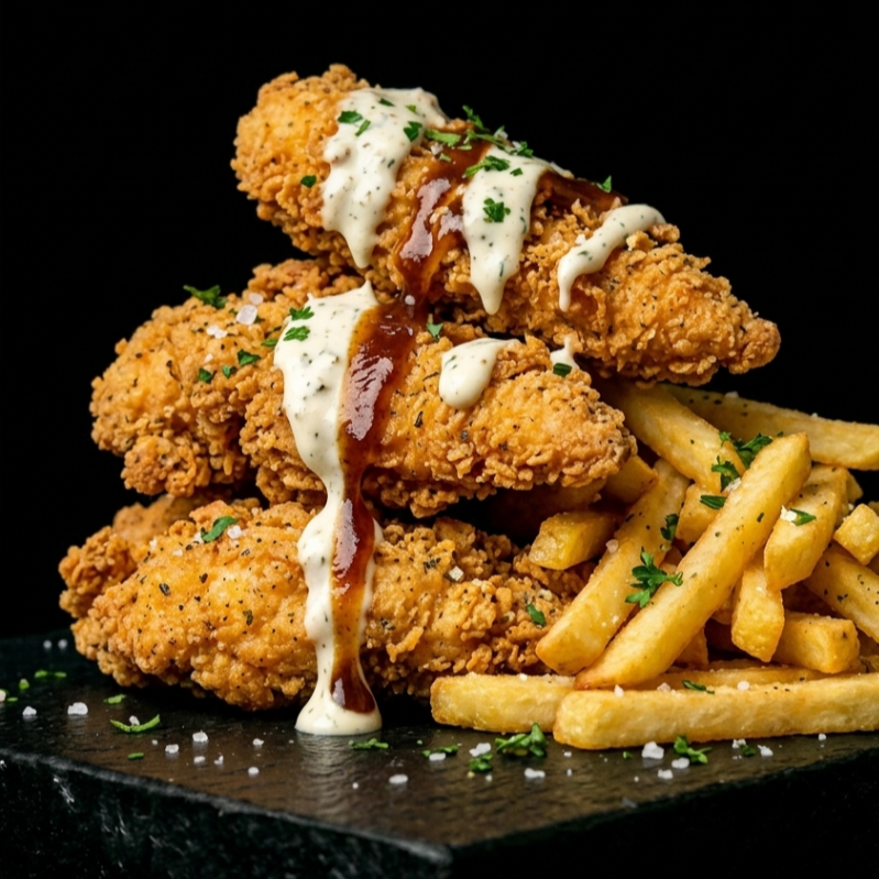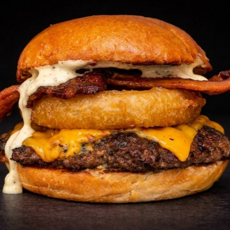 Pan papa, carne 140 g, cheddar, tocineta y aros de cebolla apanados. acompañada de papas a la francesa
