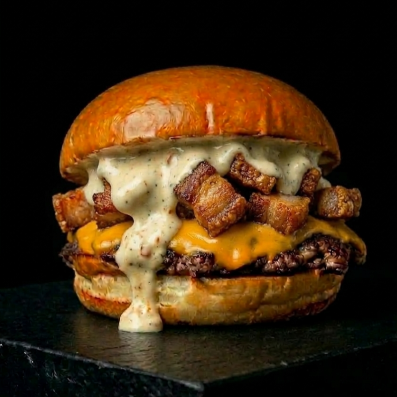 Pan artesanal, carne 140 g, trozos de chicharrón, dip de pimentón, queso cheddar, encurtido de cebolla, lechuga y tomate. con papas francesas