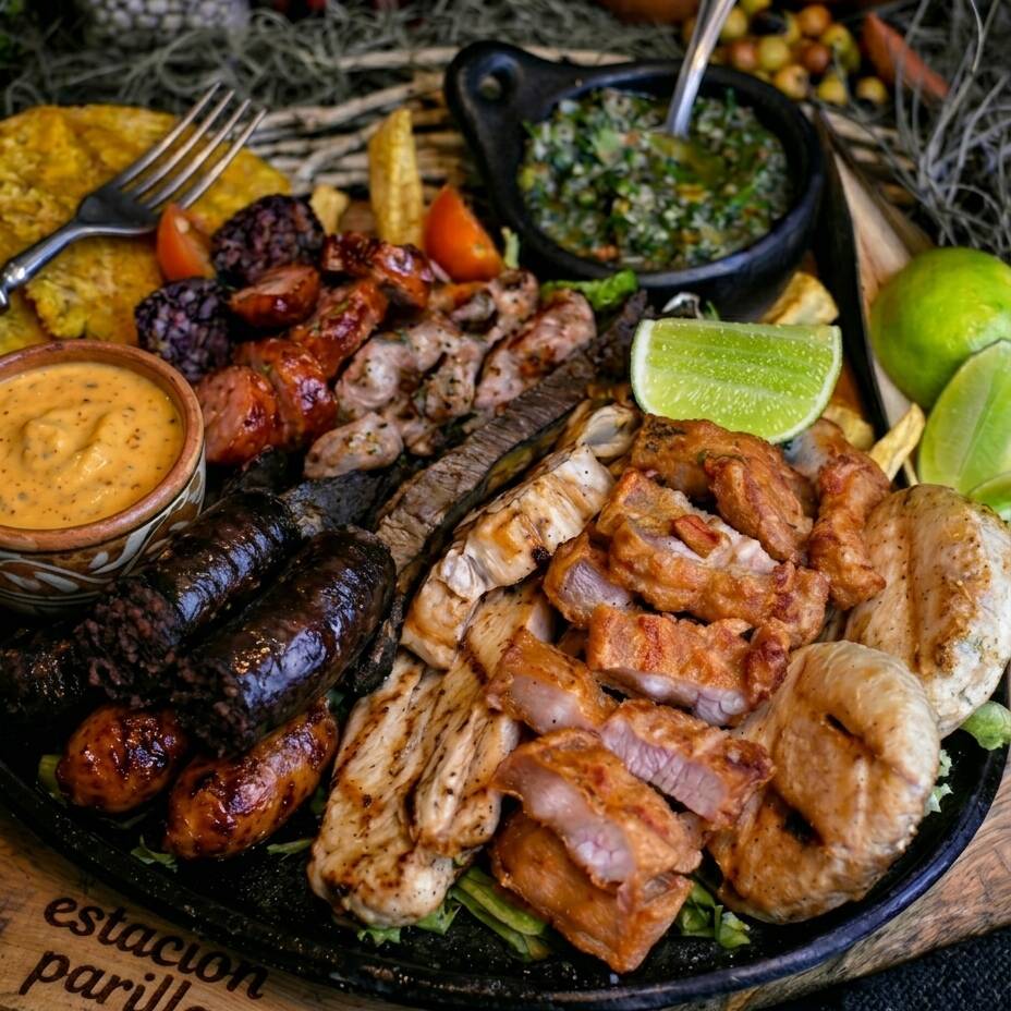 Res, cerdo, chicharrón, chorizo, morcilla, aros de cebolla apanados, papas a la francesa, patacones, arepa, lechuga, tomate y vinagreta.
