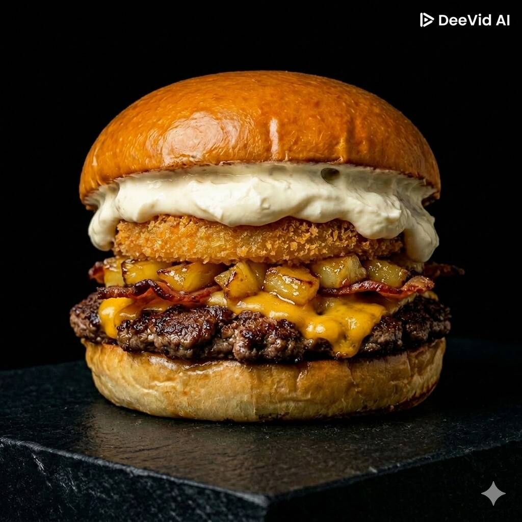 Pan artesanal, carne 140 g, tocineta, cheddar, aro de cebolla apanado, piña caramelizada y queso crema. con papas a la francesa