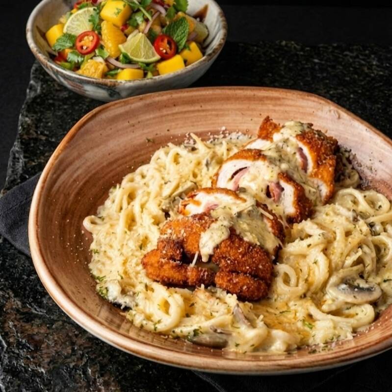 Filete de pollo apanado relleno de jamón y queso; pastas a elegir: pesto cremoso, salsa alfredo, carbonara o al burro; con ensalada de la casa.