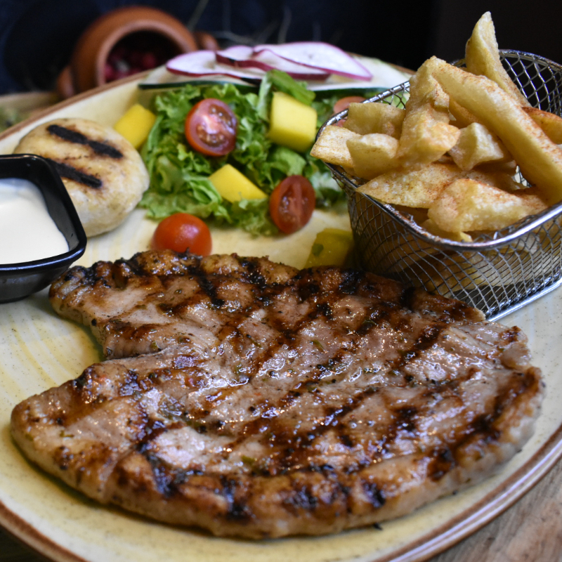 A término al gusto, con chimichurri, arepa y ensalada de la casa. Guarnición a elegir: puré, papas en casco, francesas o pastas.