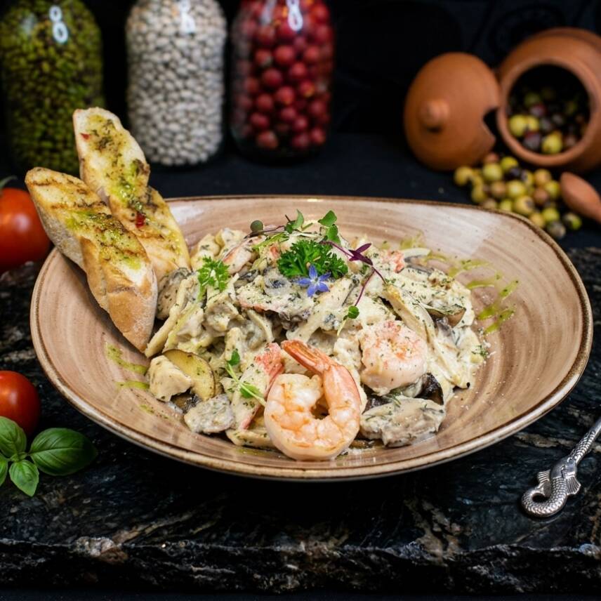 PASTAS TIPO BOLOÑESA SALTEADAS EN UN QUESO CREMA DE LA CASA, ACOMPAÑADAS DE TOSTADA DE FINAS HIERBAS
