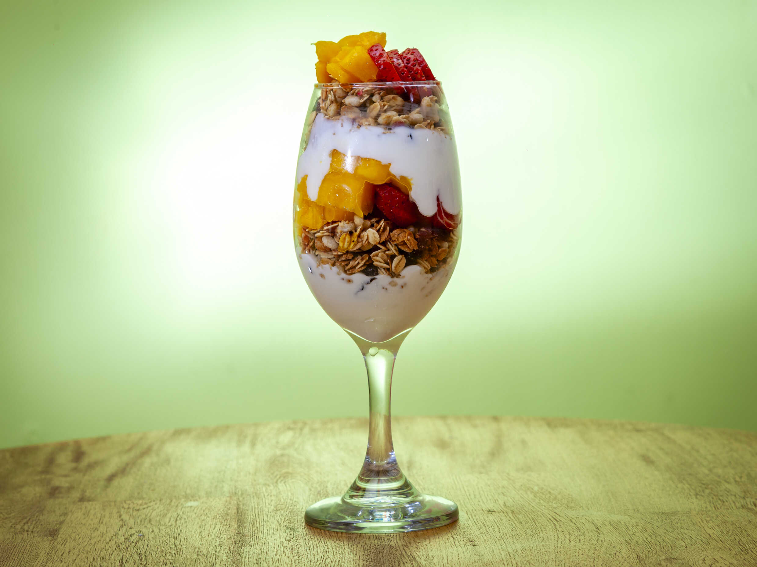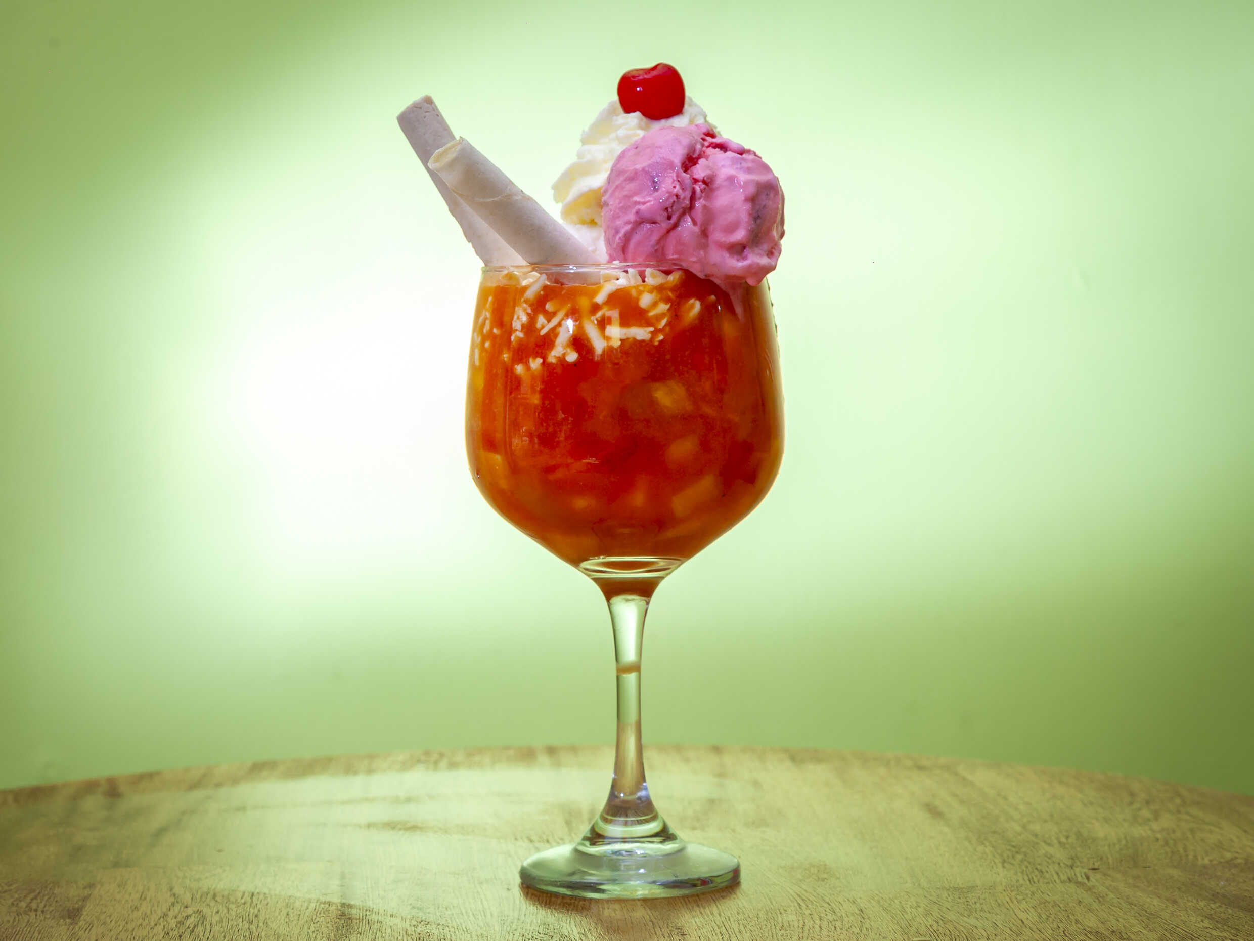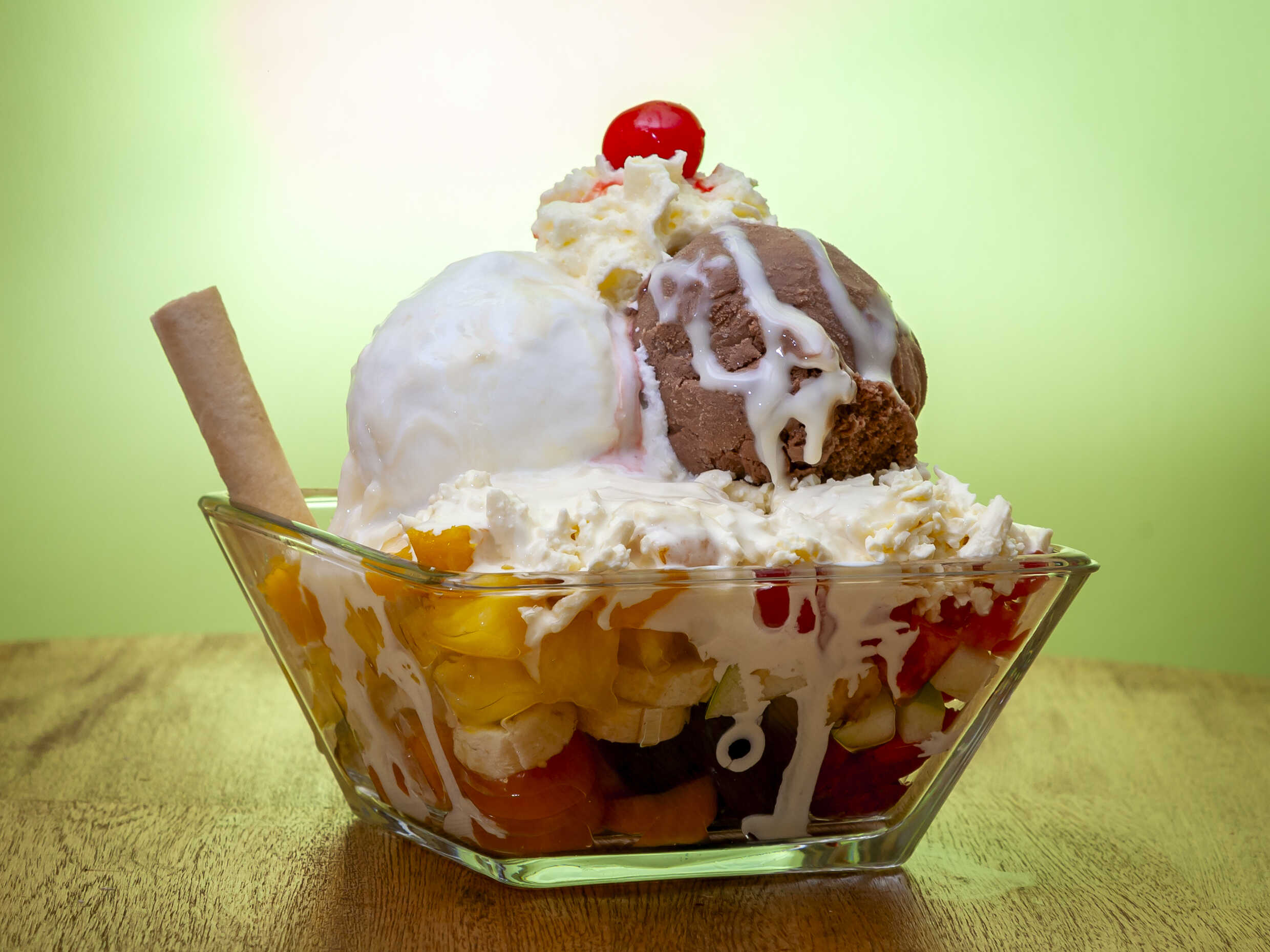 Dos bolas de helado, chantilly, queso, crema de leche, mango, papaya, manzana verde, uvas, fresas, sandía, banano, leche condensada y barquillo,