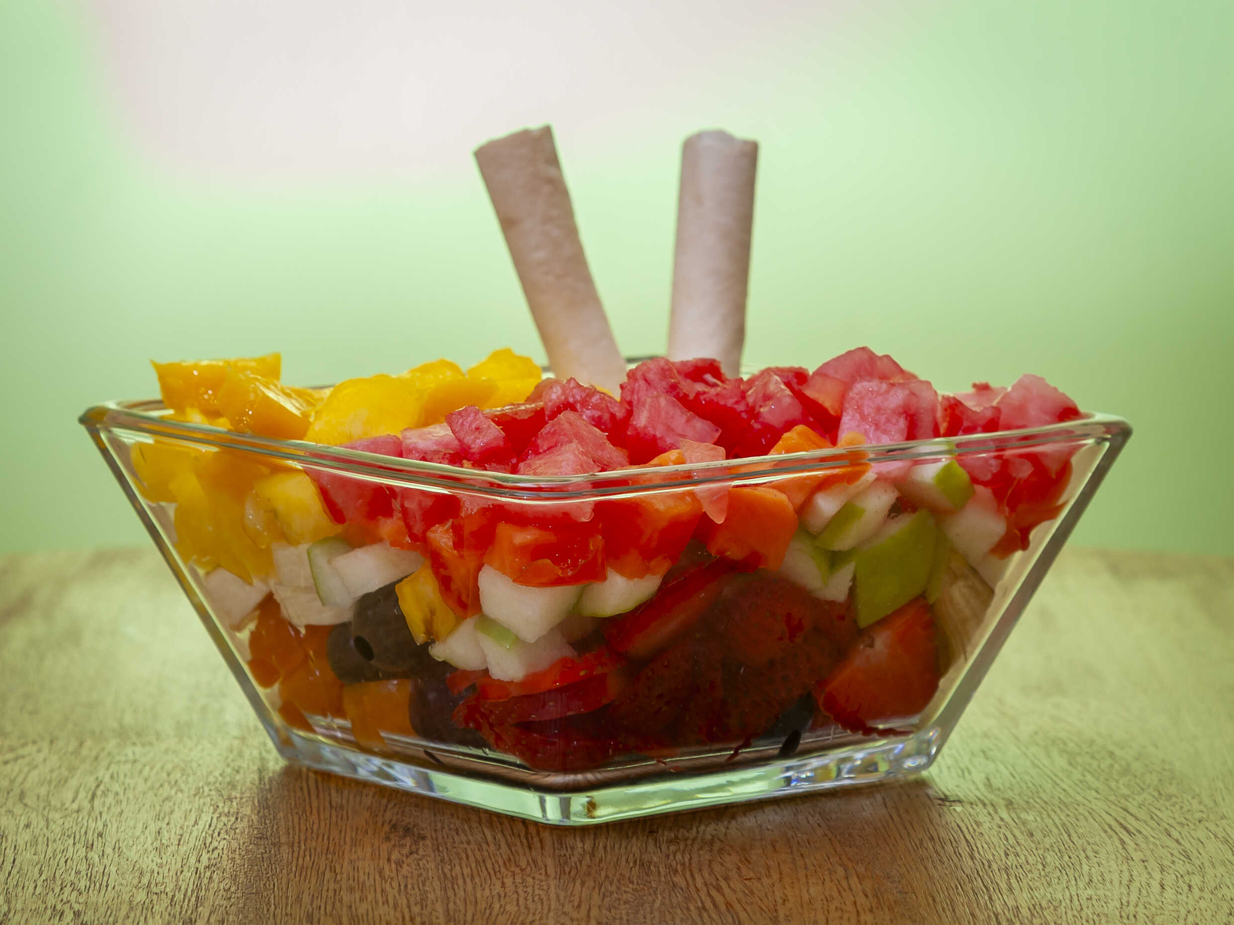 Mango, papaya, manzana verde, uvas, fresas, sandía, banano y barquillo.