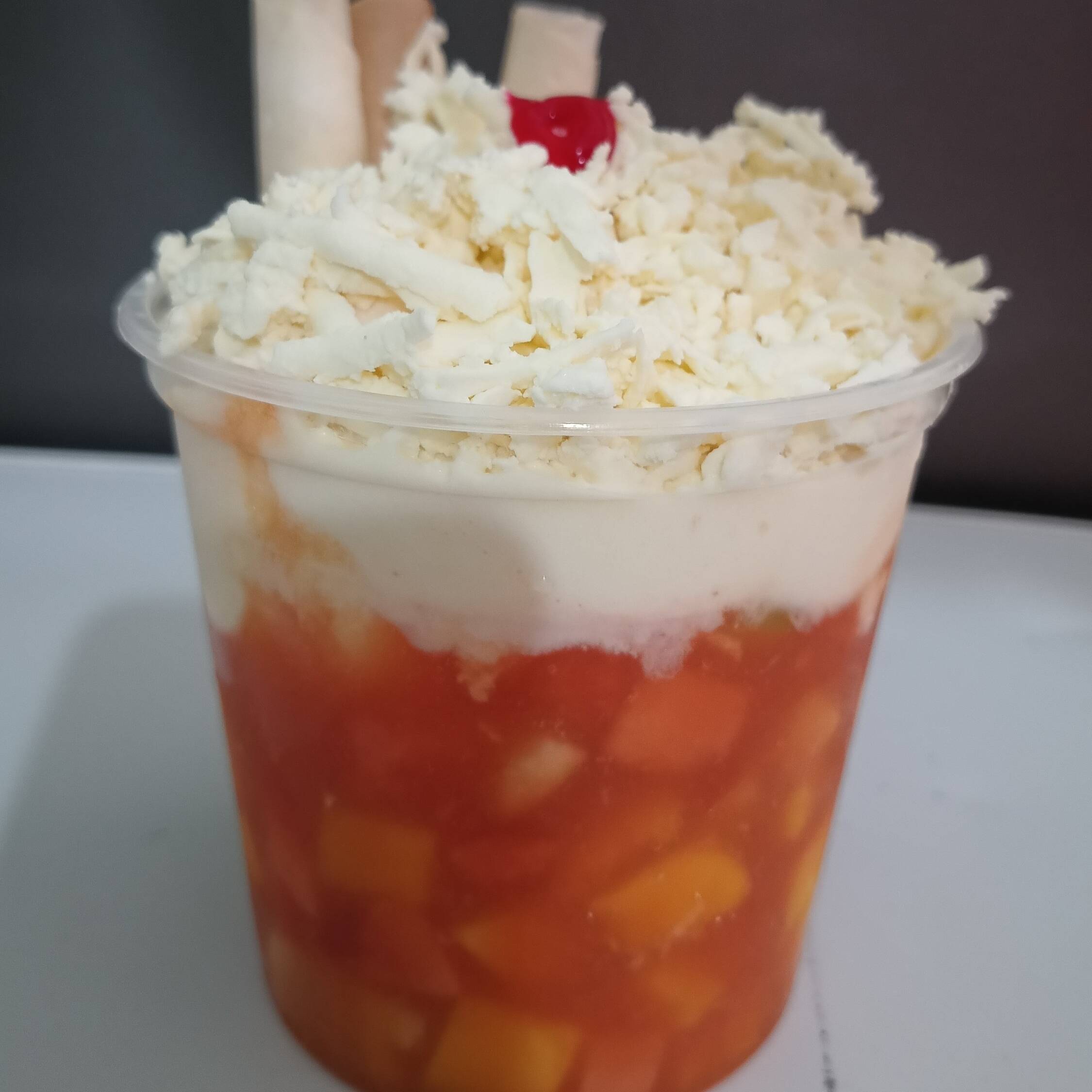 crema de la casa, piña calada mango ,durazno, dos bolas de helado ,chatilly