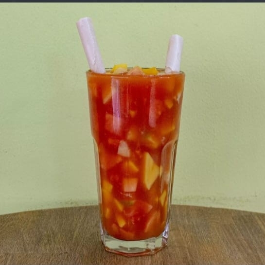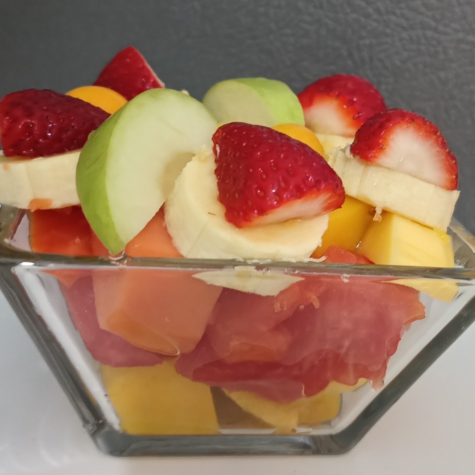 Mango, papaya, manzana verde, fresas, sandía, y banano