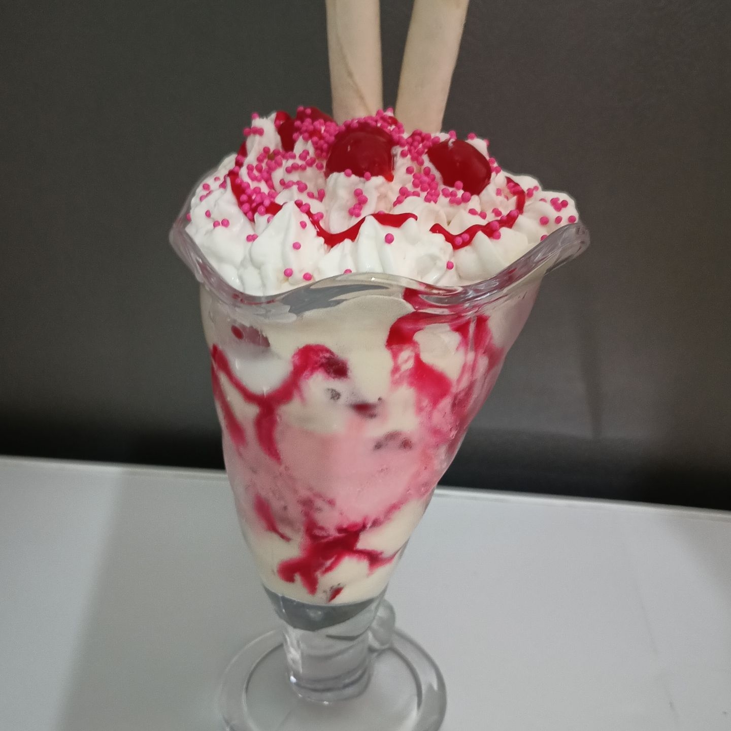 salsa de cereza,crema de la casa ,dos bolas de helado ,cerezas y chantilly y barquillo