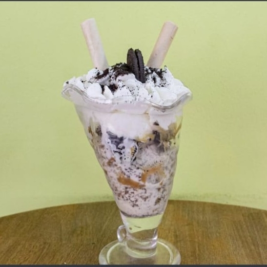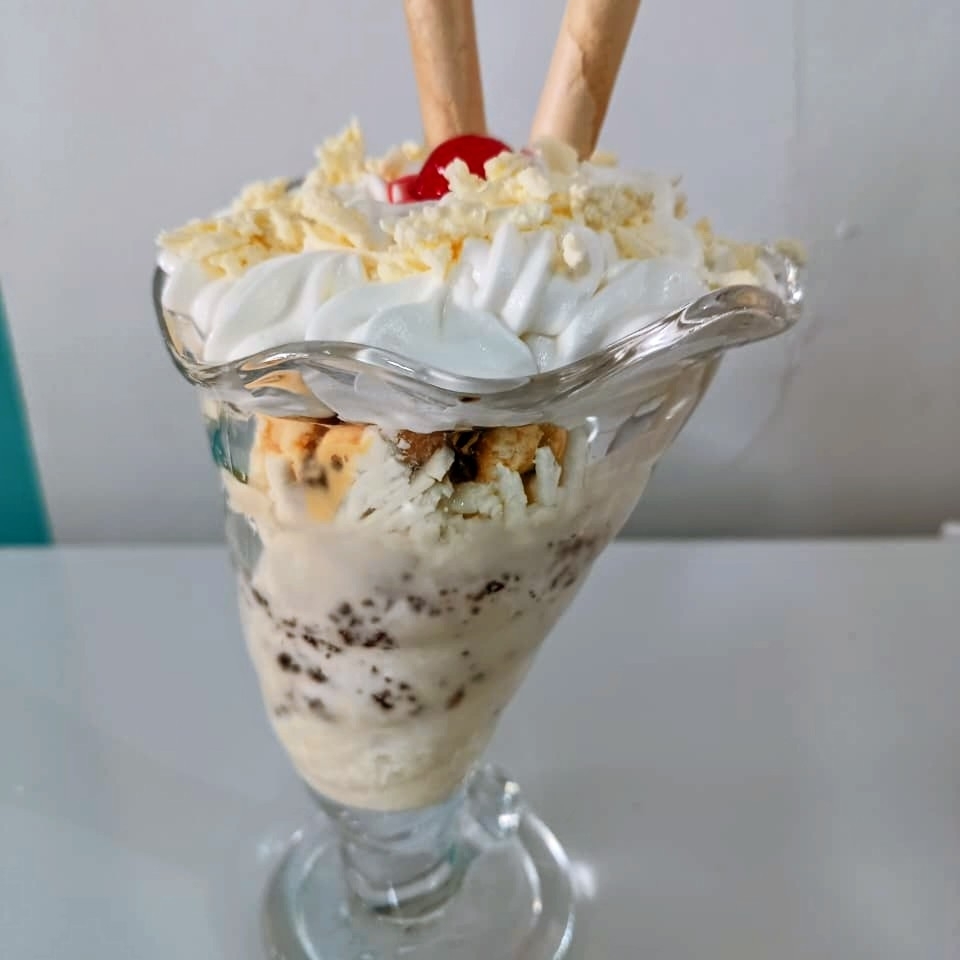 salsa de arequipe ,crema de la casa,galleta triturada ,dos bolas de helado ,chantilly y barquillo