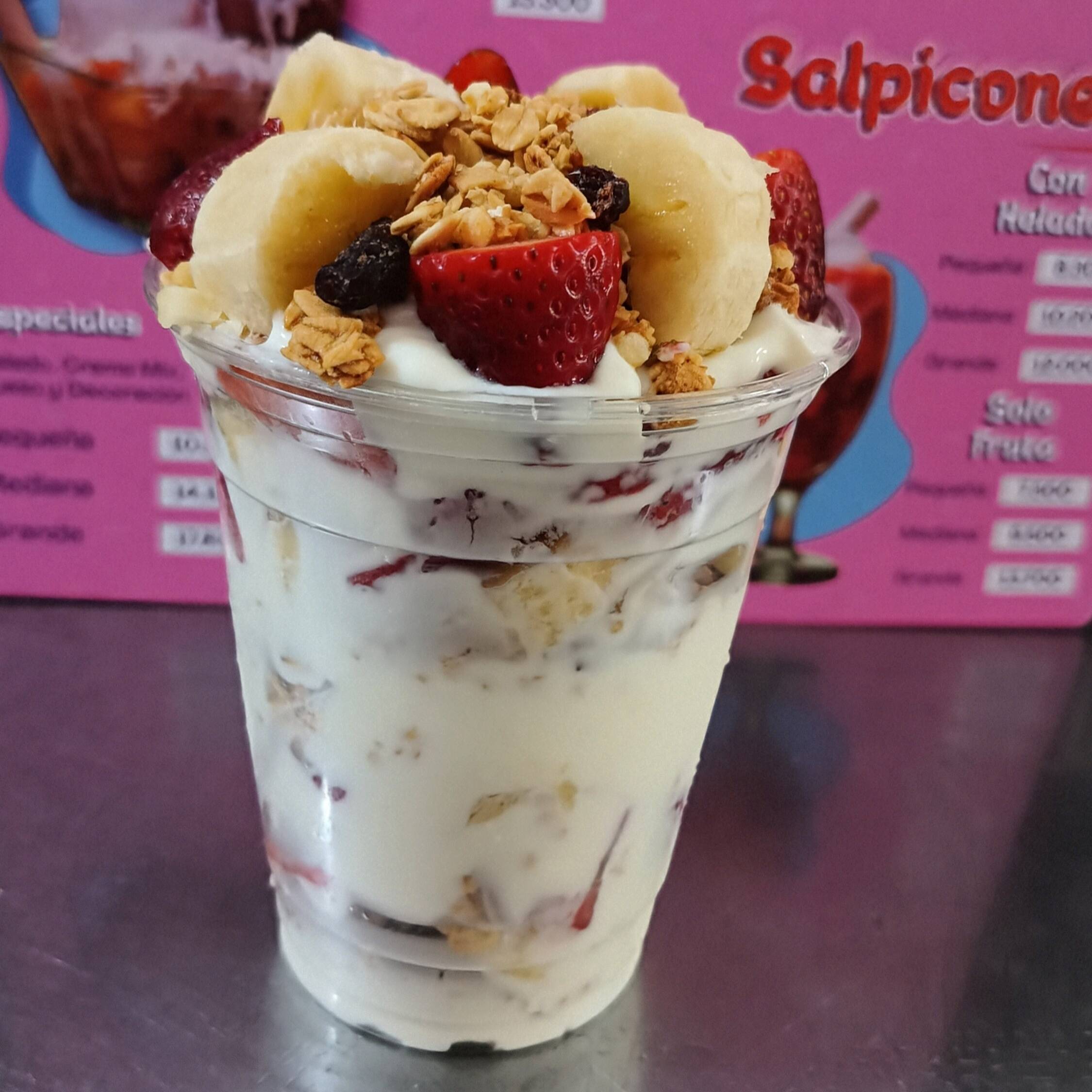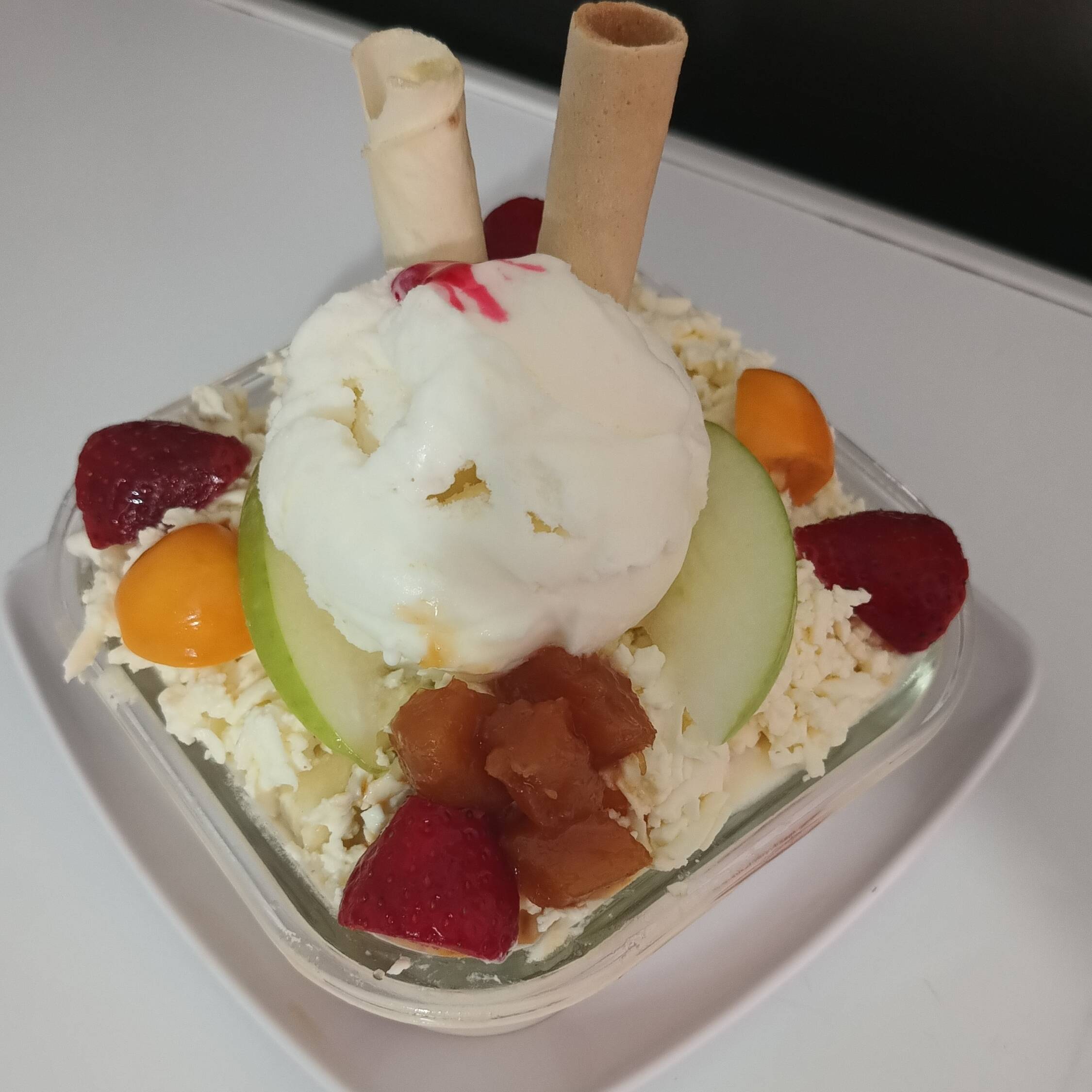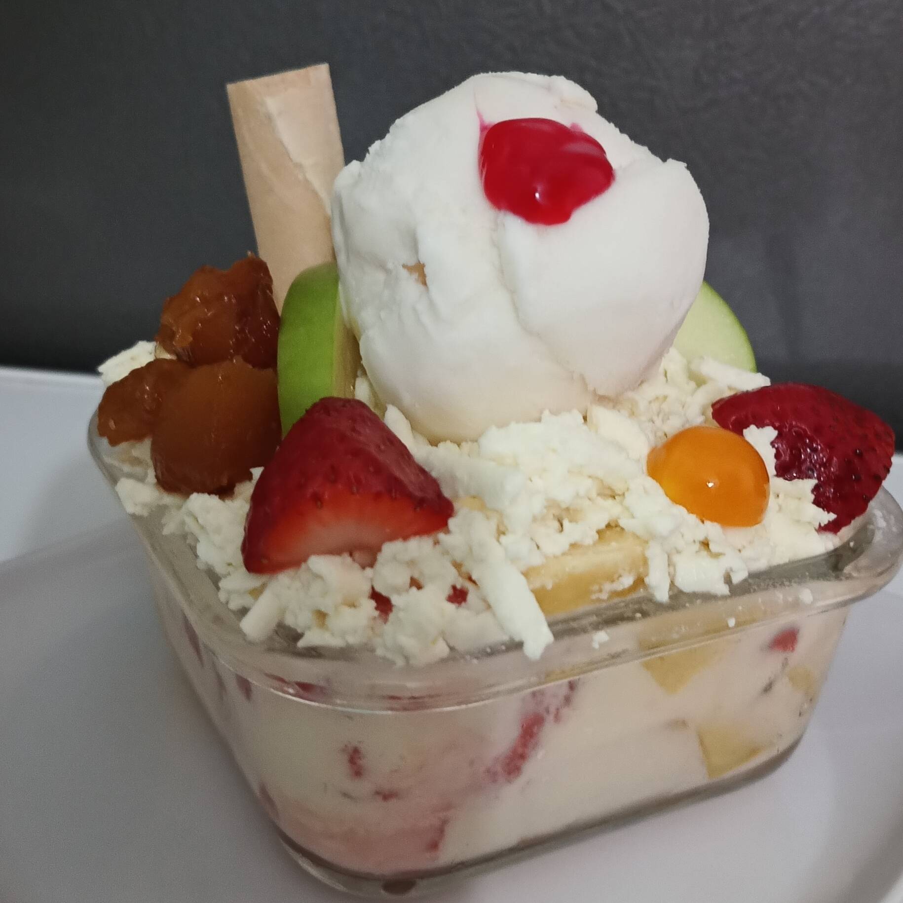 salpicon, con crema de la casa ,una bola de helado, queso rallado barquillo