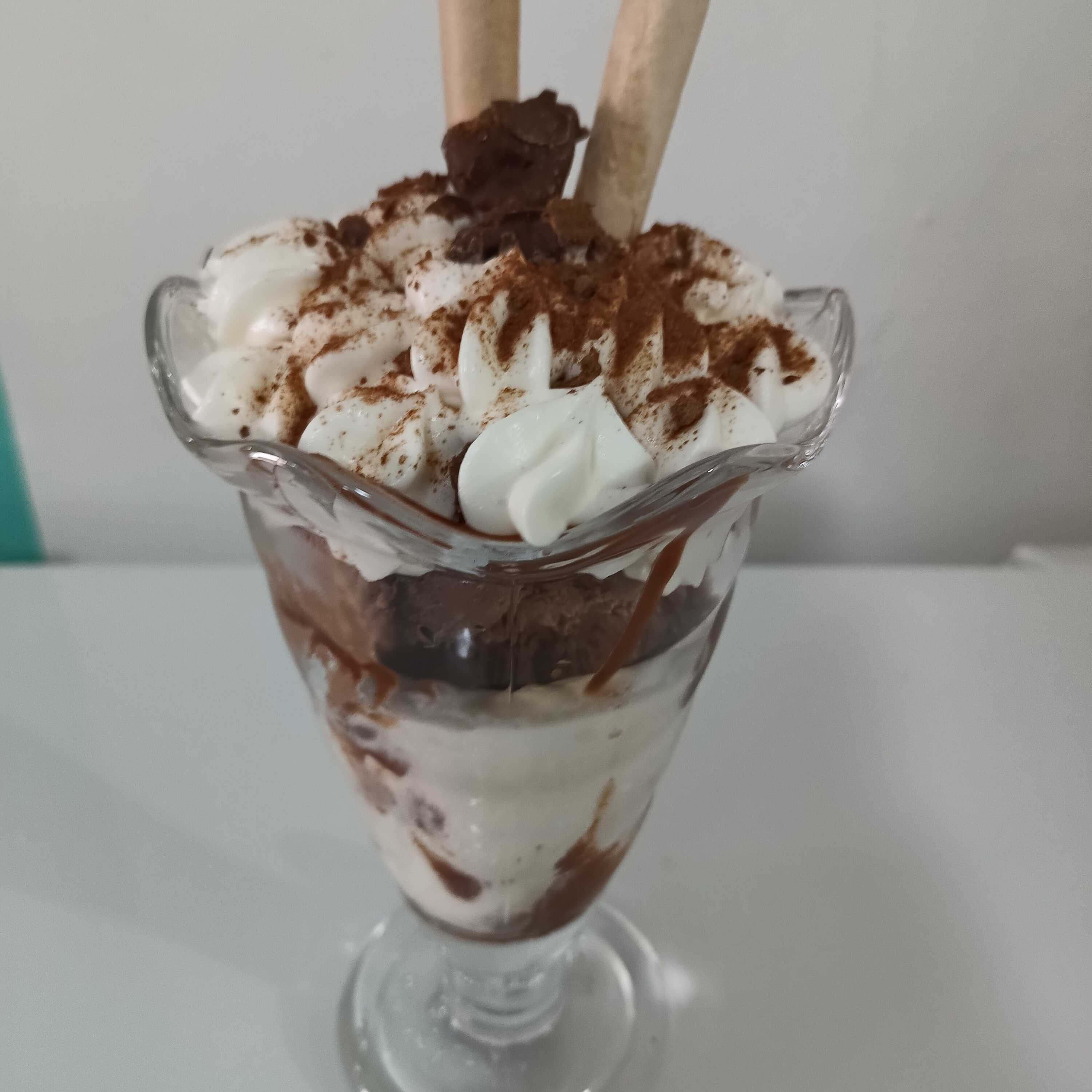salsa de chocolate ,crema de la casa, polvo de milo ,nuggets de milo,chantilly barquillo