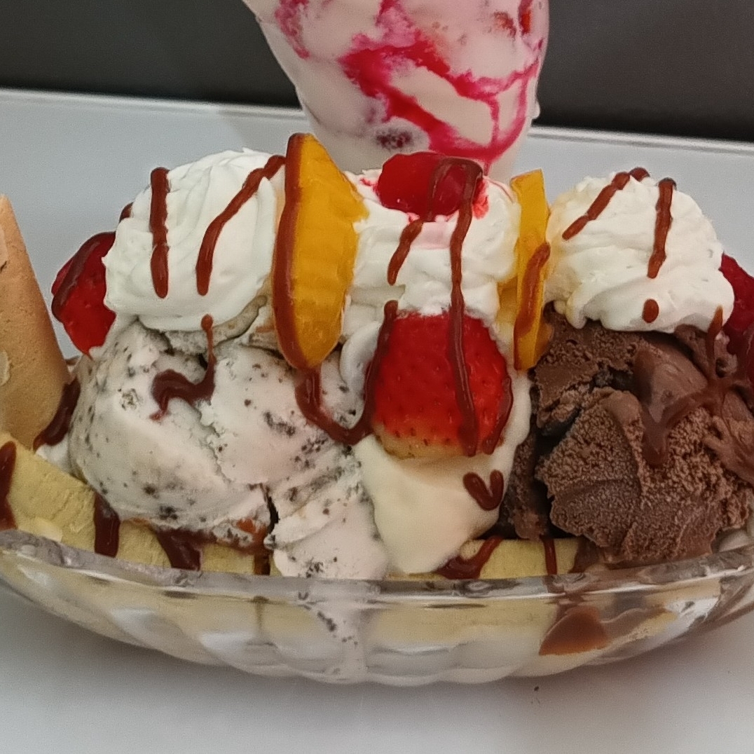 banano, 3 bolas de helado,chantilly durazno y fresas,salsa de chocolate, y barquiilo