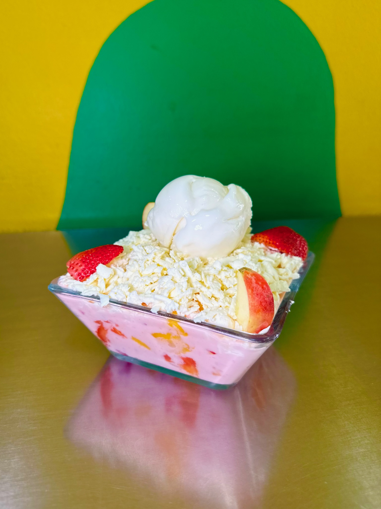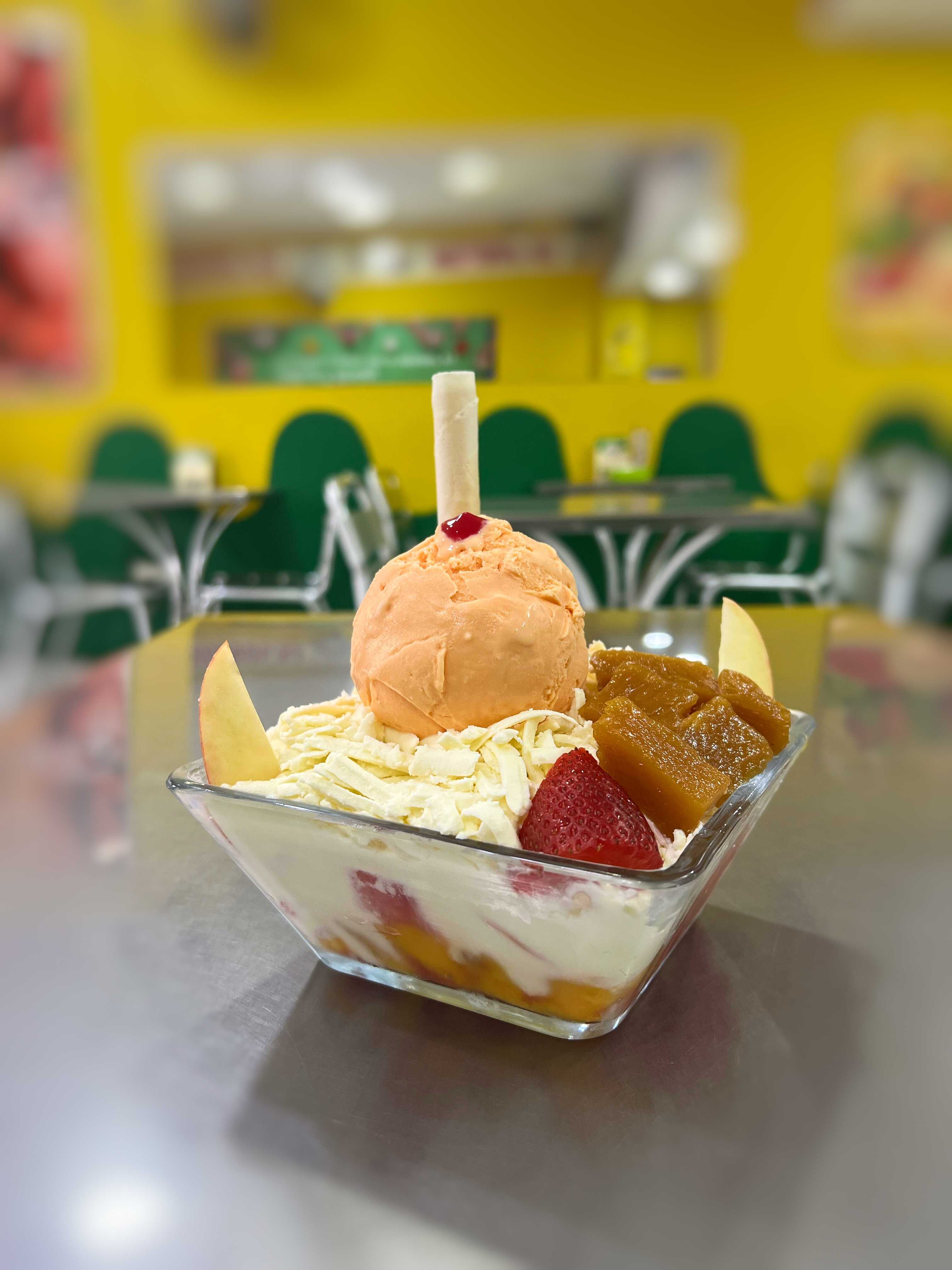 Base de frutas frescas: banano, mango, papaya y sandía, cubierta de crema jugosa, cuajada rallada, 1 sabor de helado y decoración.