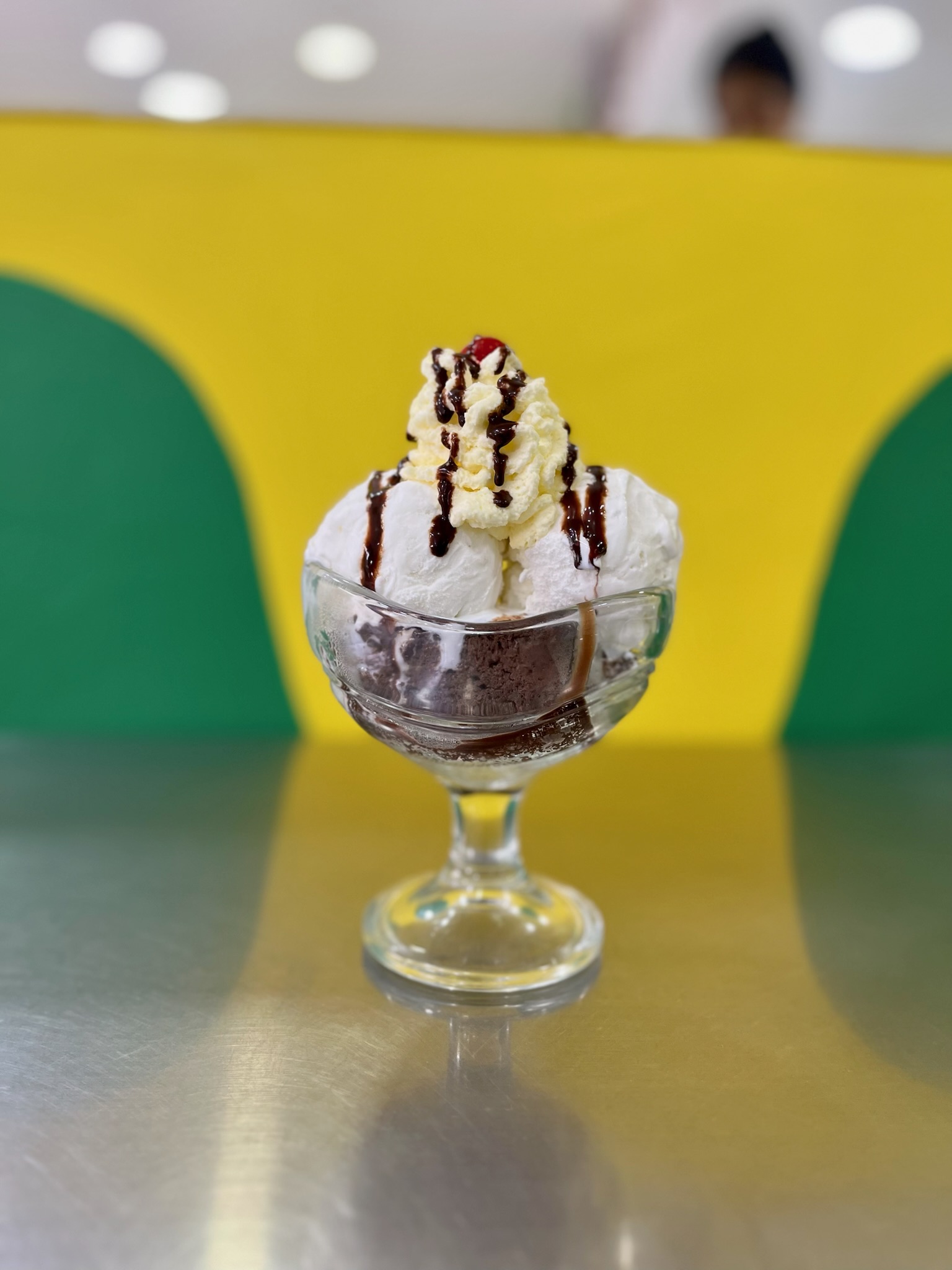 Brownie de chocolate, acompañado de helado de vainilla, chantilly, salsa de chocolate, cereza y salsa de chocolate.