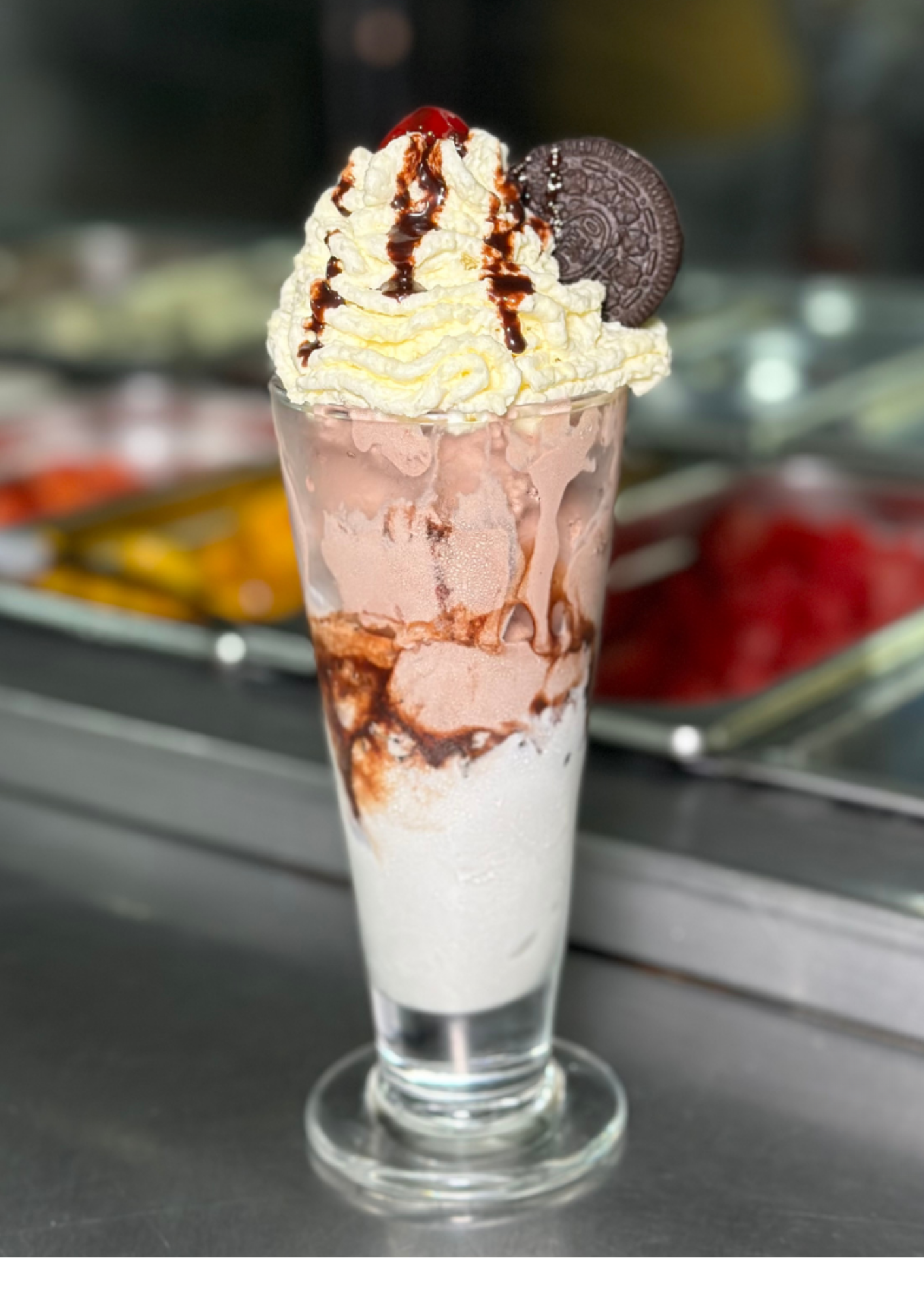Helado de chocolate y vainilla, acompañado de trocitos de galleta Oreo, salsa de chocolate, crema chantilly y decoración.