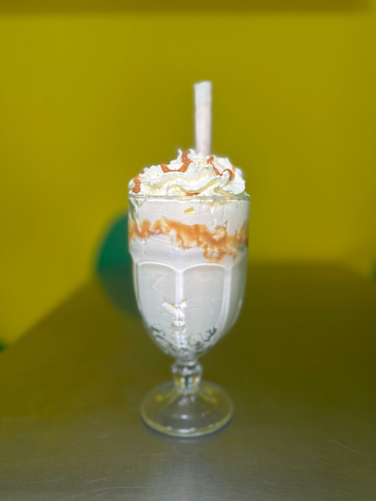 Deliciosa malteada sabor a elección, acompañada de salsa de chocolate, crema chantilly y decoración.