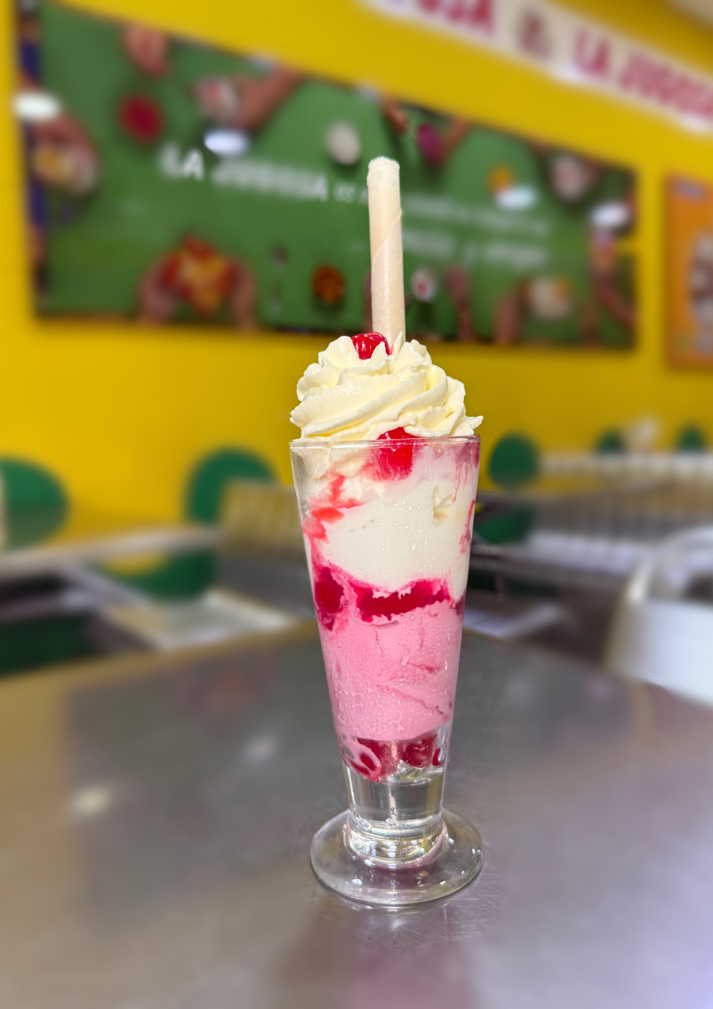 Trocitos de fresas y banano, acompañados de helado de fresa y vainilla, crema chantilly y decoración.