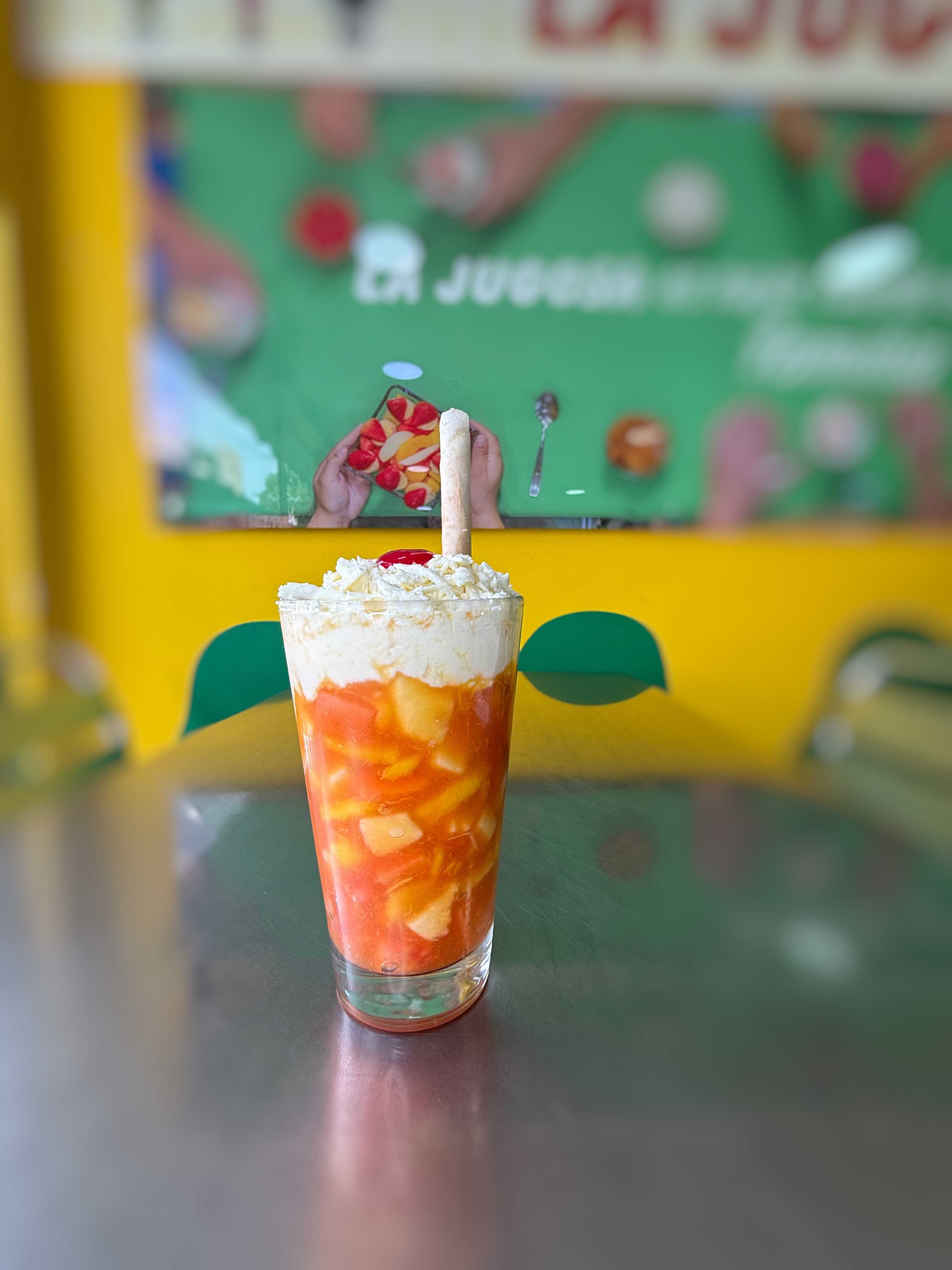Base de salpicón cubierta con crema jugosa, helado y cuajada rallada + Jugo en leche con sabor a eleccion