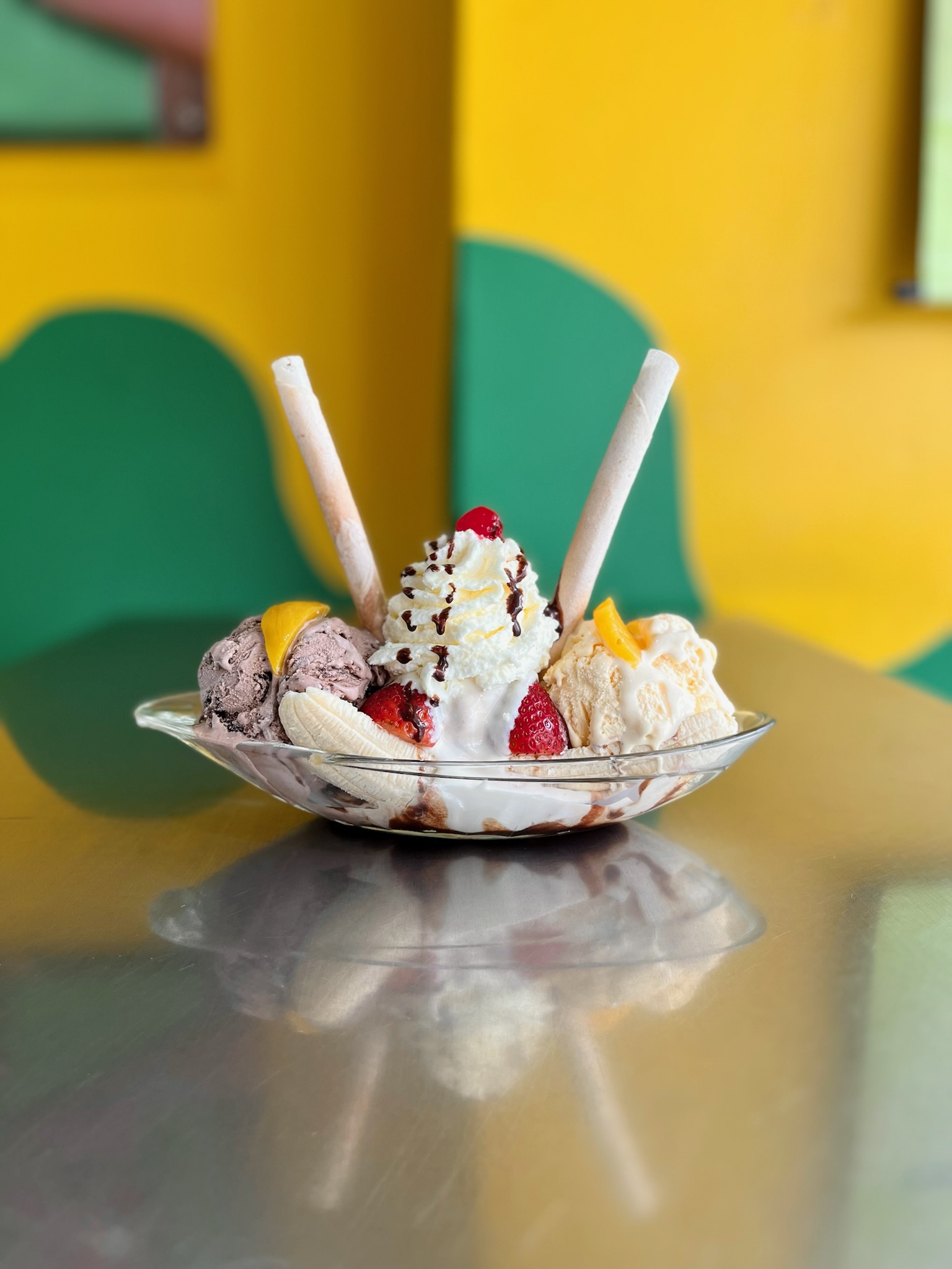 Base de banana, acompañada de tres sabores de helado, salsa de chocolate, crema jugosa, chantilly, con fresa y durazno de decoración.