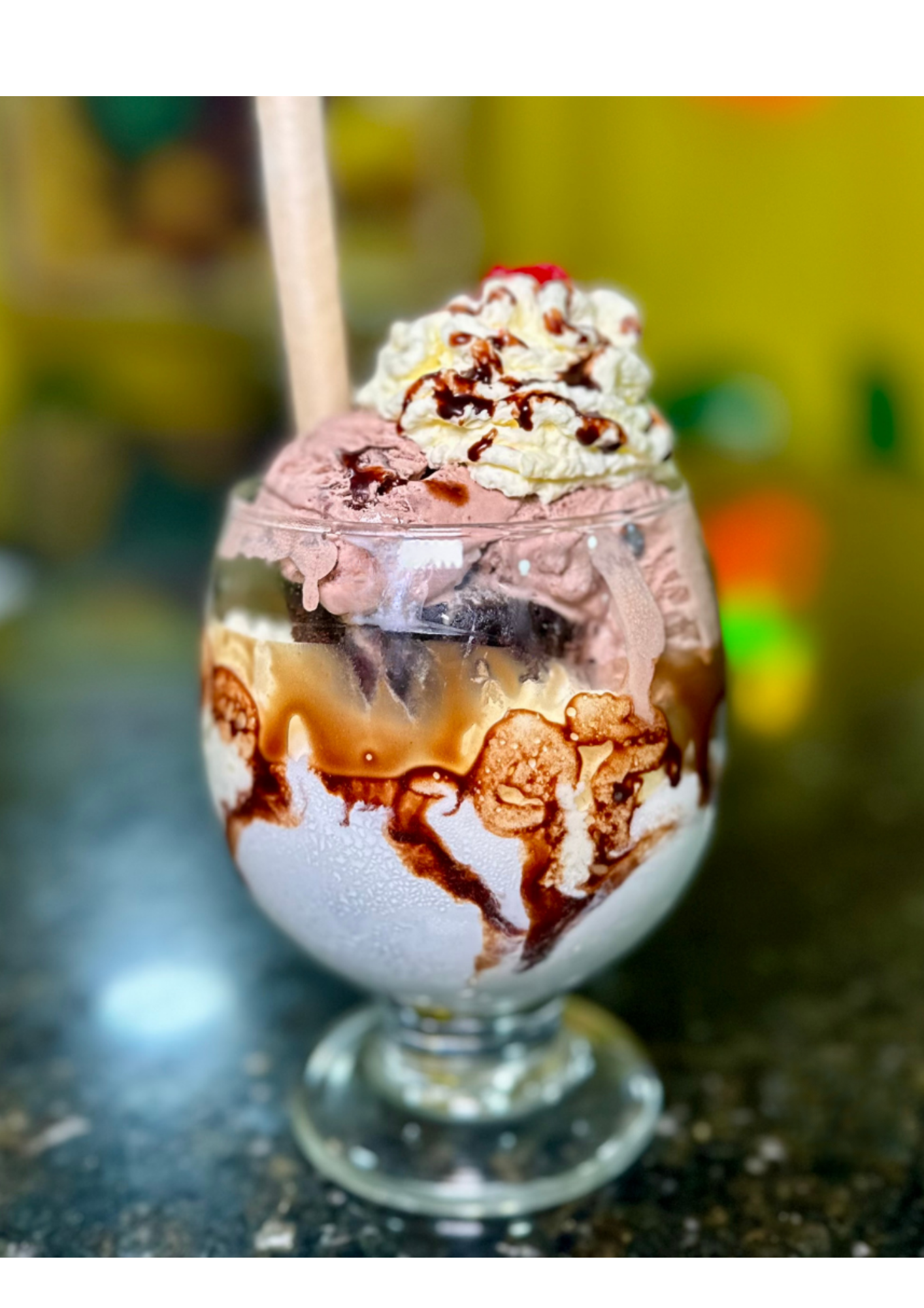 Deliciosa combinación de helado de vainilla y chocolate, acompañada de torta envinada, crema chantilly, salsa de chocolate y decoración.