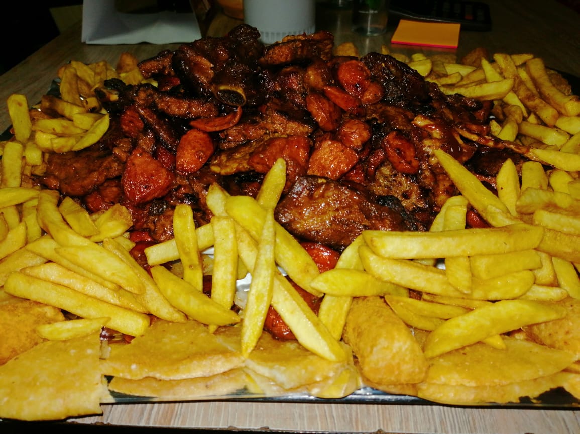 Papas, salchicha, huevo de codorniz, chorizo coctelero, pollo, carne, chorizo ternera, queso mozzarella y salsas de la casa.