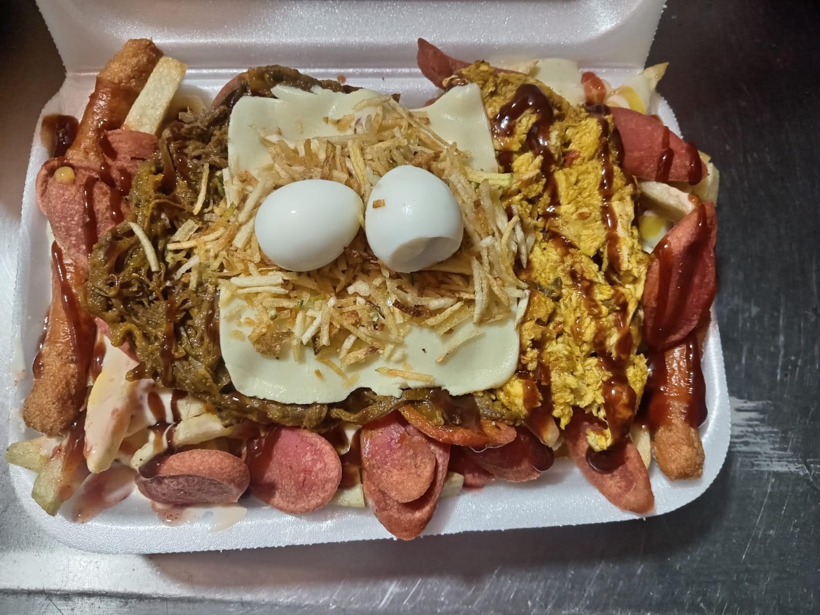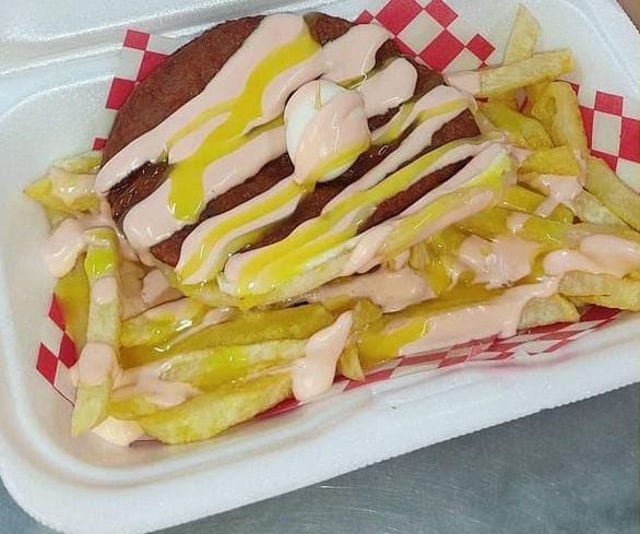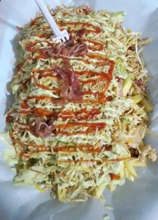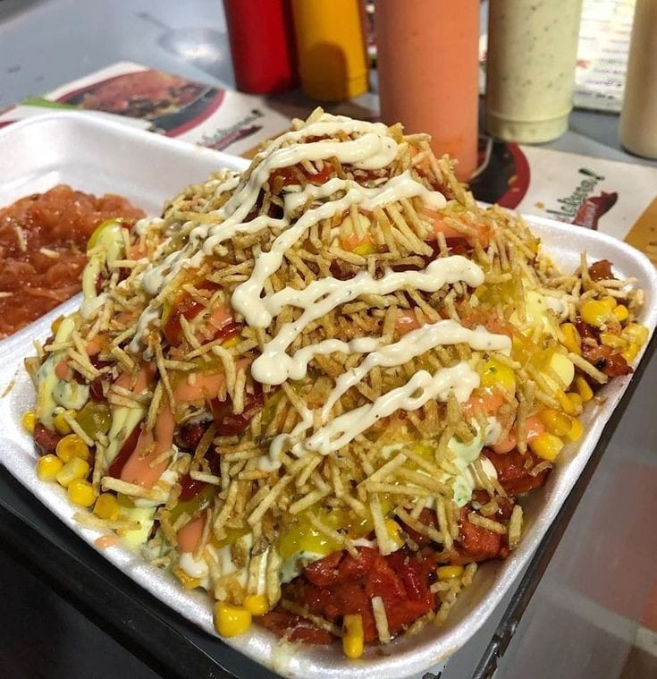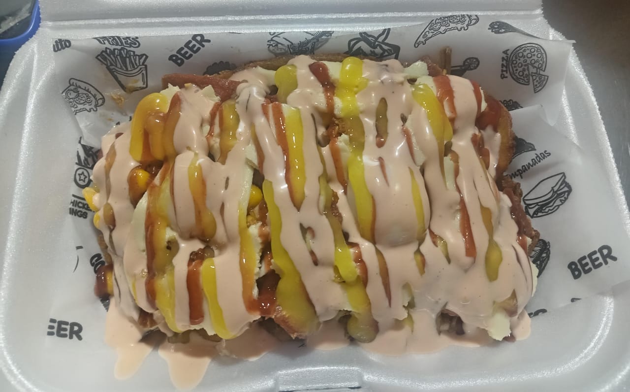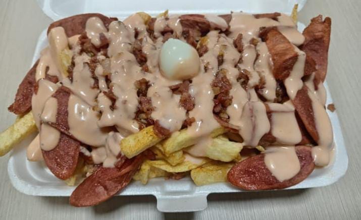 (Papas, salchicha, huevo de codorniz, chorizo coctelero, queso costeño, maicitos, carne desmechado y salsas de la casa).