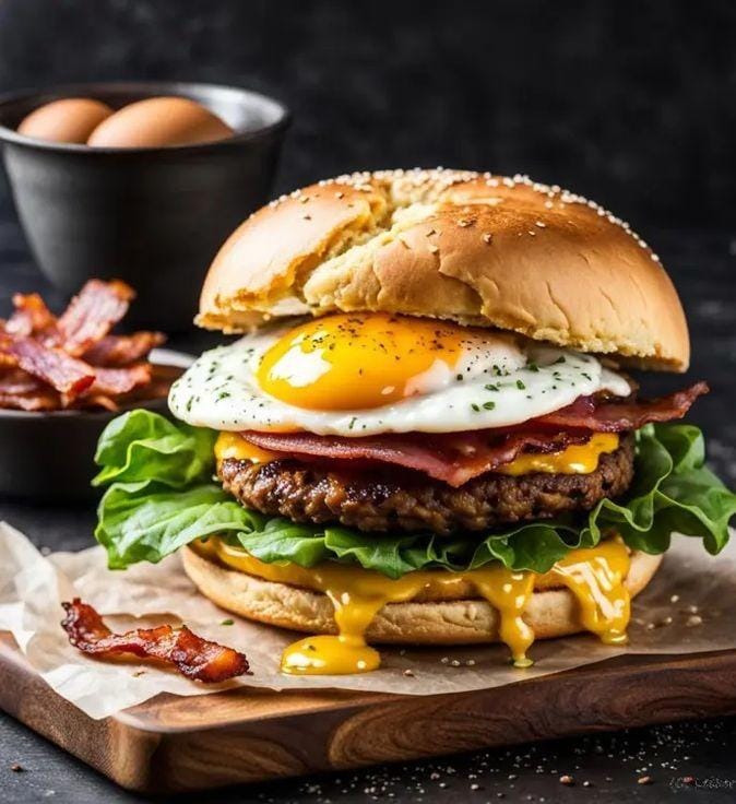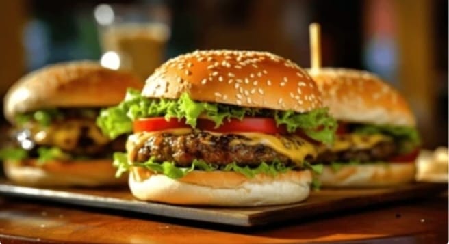 Pan artesanal , carne de res, queso mozzarella, tomate, cebolla caramelizada, lechuga, huevos de codorniz y salsas de la casa.