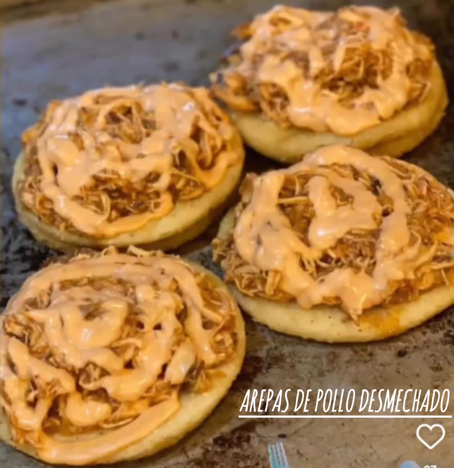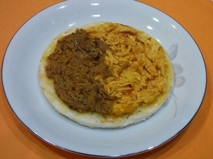 arepa tela Queso mozzarella Pollo desmechado Salsa de la casa