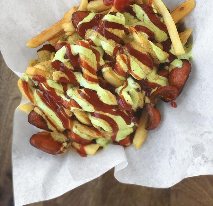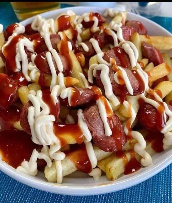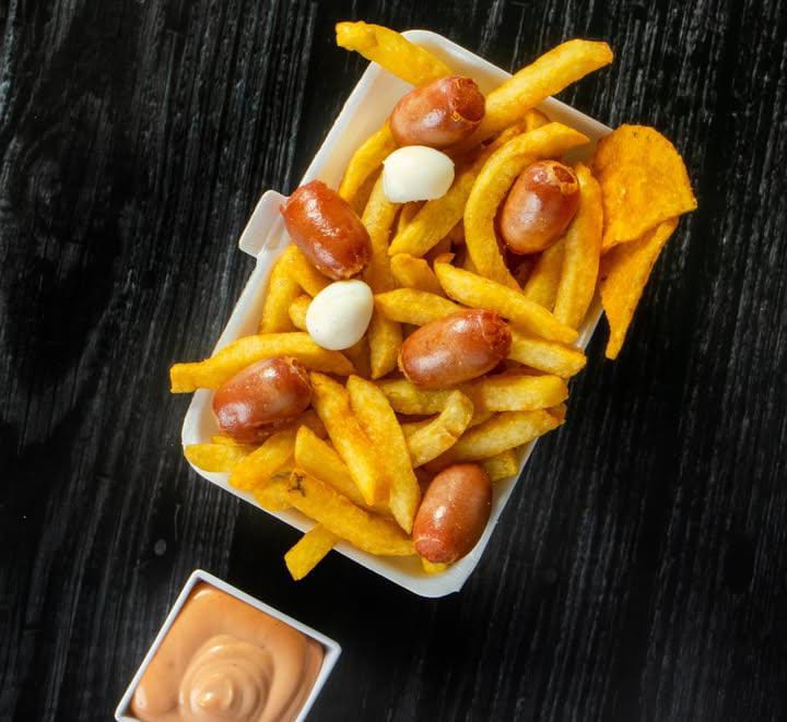Papas a la francesa , salchicha, huevo de codorniz, chorizo coctelero, pollo carne, chorizo ternera, queso mozarela y salsas de la casa.