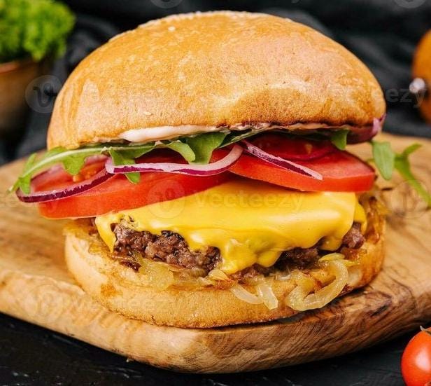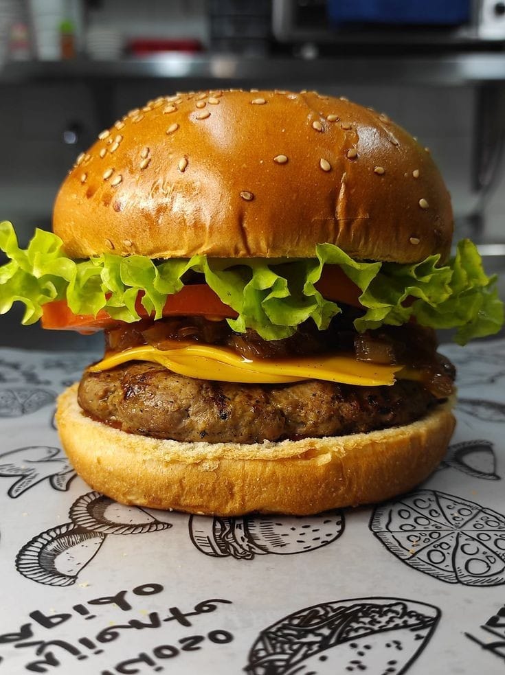 Pan artesanal , carne de res, queso mozzarella, tomate, cebolla caramelizada, lechuga y salsas de la casa.