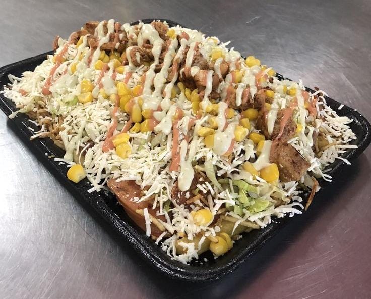 Papas, salchicha, huevo de codorniz, chorizo coctelero, pollo, carne, queso mozzarella y salsas de la casa.