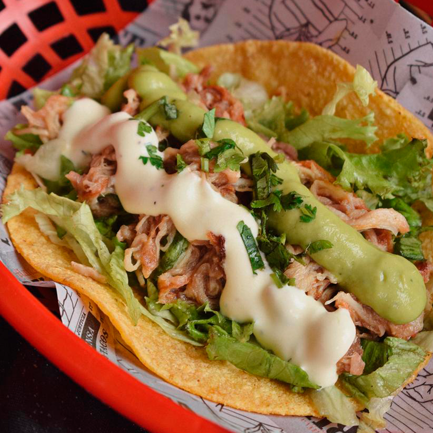 Jugosa carne de cerdo bañada en salsa dulce de la casa, acompañada de lechuga con la cremosidaddel guacamole y sour cream, tortilla de maíz color amarillo.