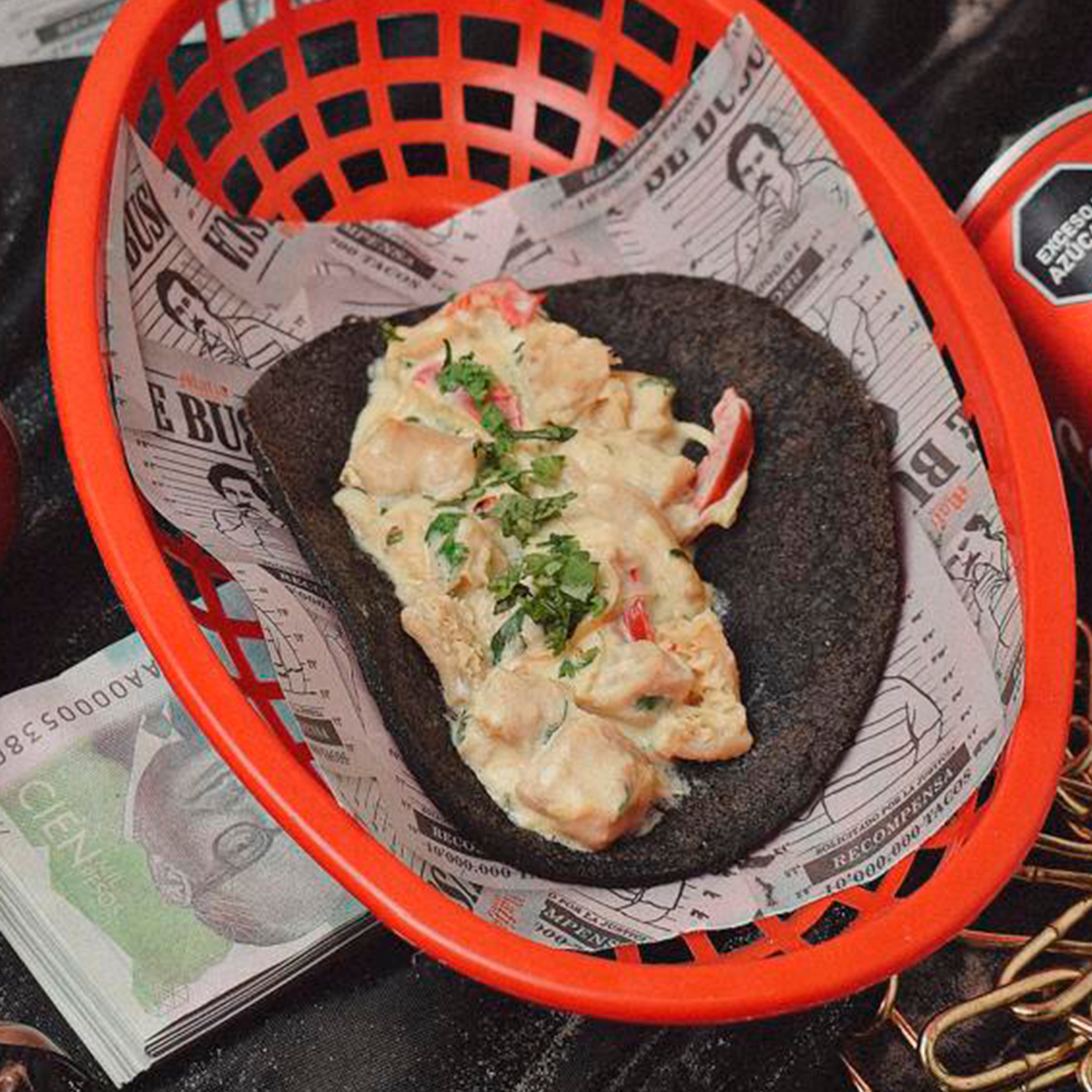 Cuidadosamente cocido hasta que esté suave y jugoso, bañado en nuestra irresistible salsa mafia que lo llenará de sabor, tortilla de maíz color negro.