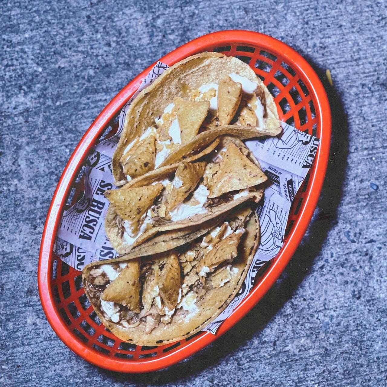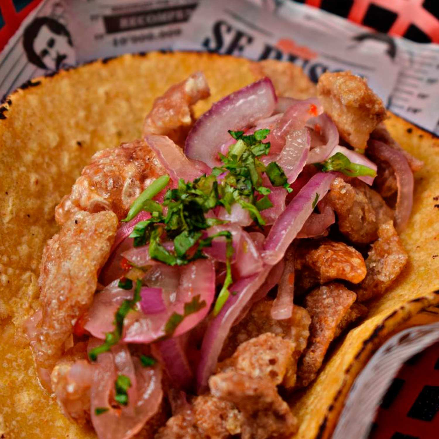 Imagina una crujiente y sabrosa capa de chicharrón crunch combinada con la frescura del mar gracias a la deliciosa salsa acevichada, tortilla de maíz color amarillo.