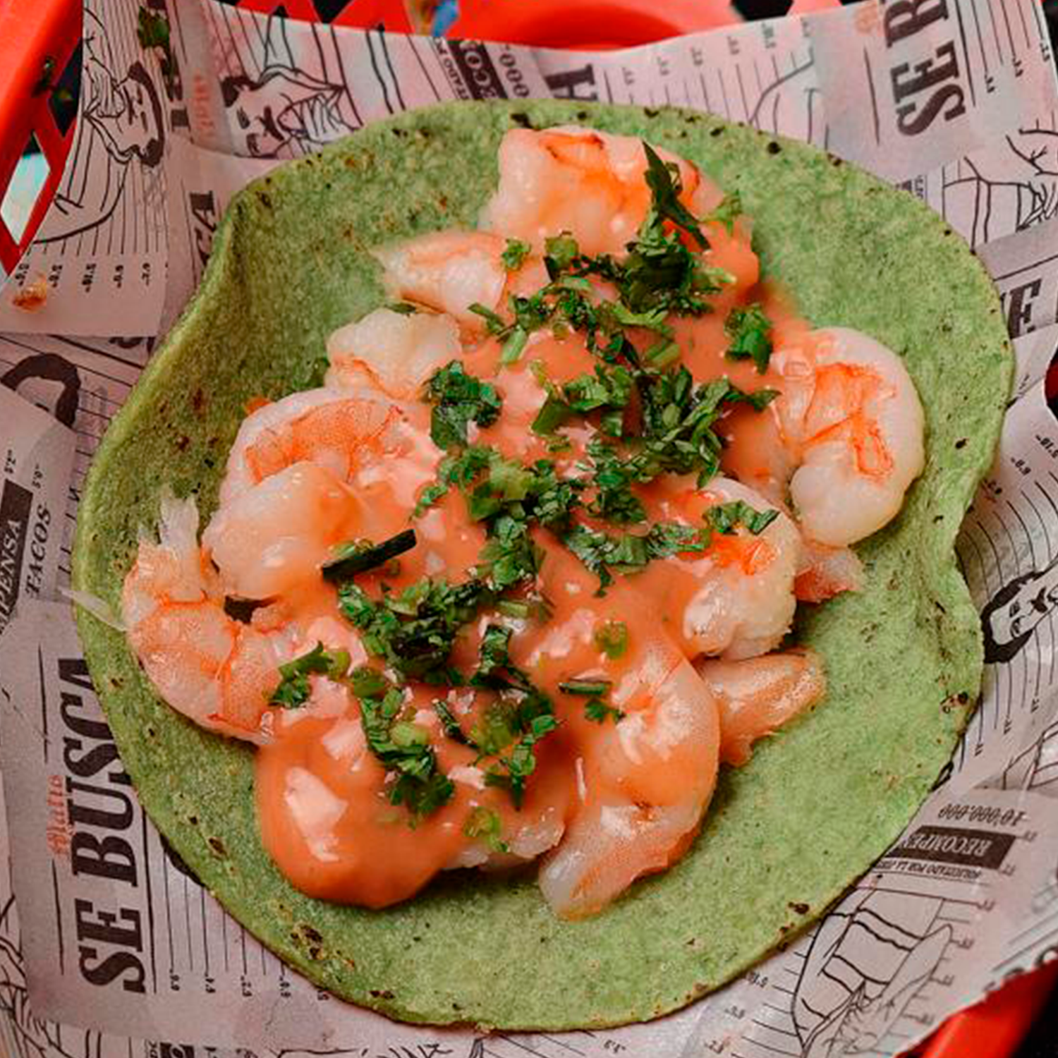 Camarones frescos y jugosos, bañados en nuestra salsa rosada especial que le da un sabor único y una textura cremosa que te hará pedir más, tortilla de maíz color verde.