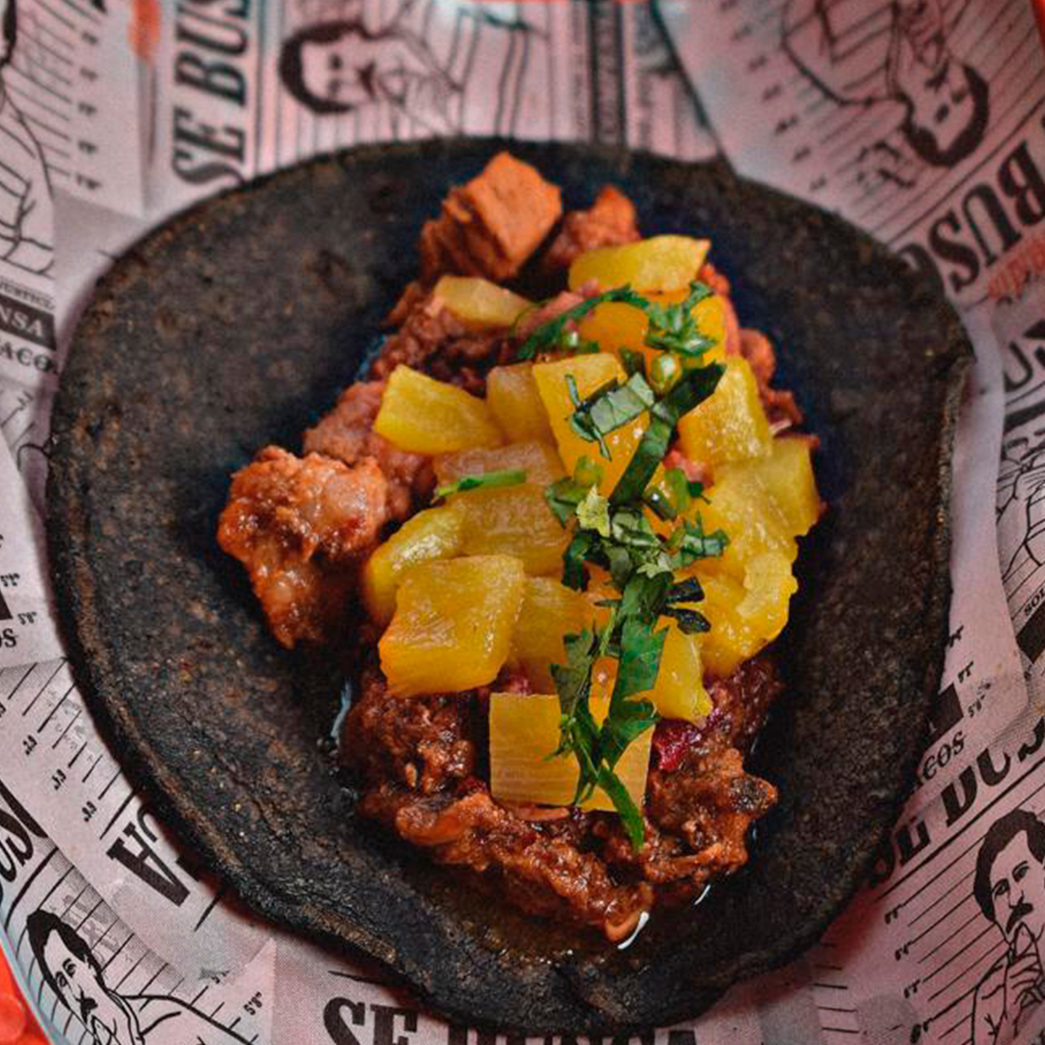 Irresistible mezcla de solomo y pierna de cerdo bañada en una salsa única de sabor adictivo con piña asada para un toque dulce y refrescante, tortilla de maíz color negro.
