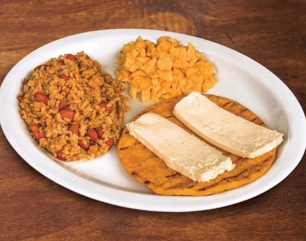 calentado de frijol con arroz, ccarne a aleccion arepa con queso y chocolate o café.