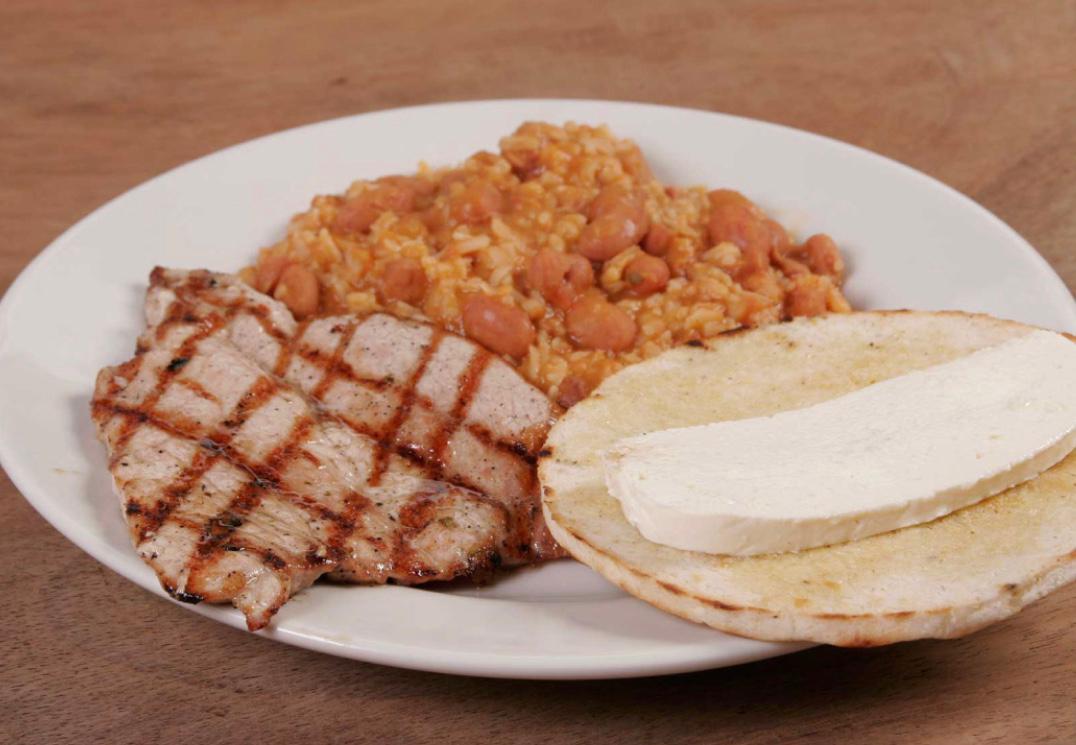 Acompañado de ensalada de la casa, 150 gramos de papas al vapor o a la francesa, 1 arepa y 1 patacón. Proteína: (130 gramos de cerdo, 130 gramos de chicharrón y 130 gramos de chorizo).
