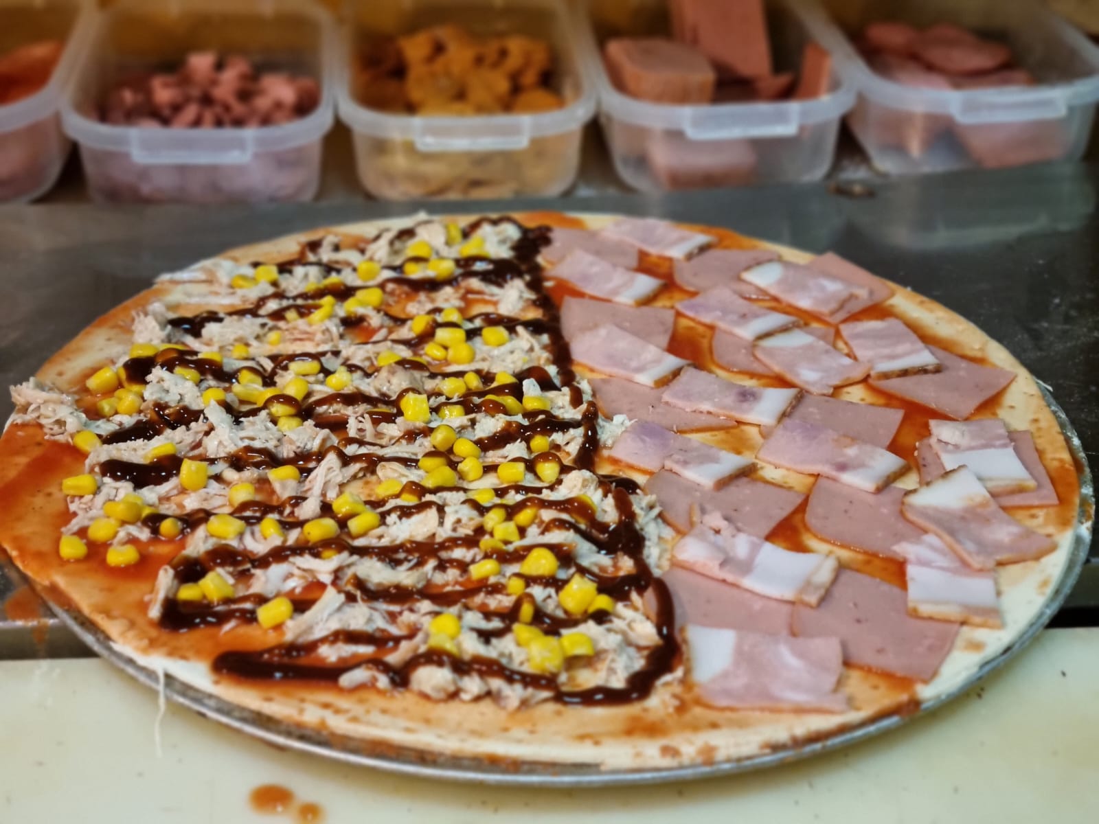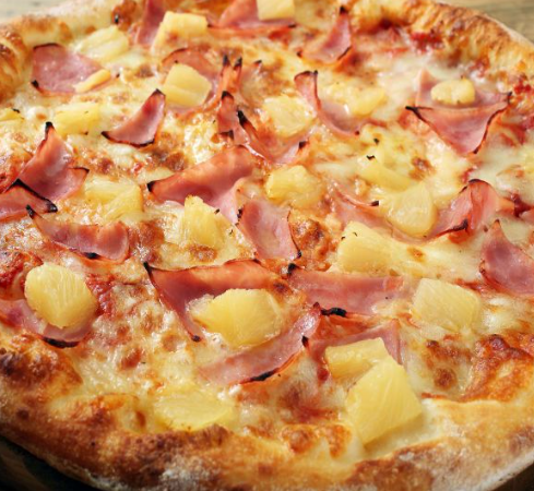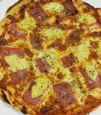 Jamón, pollo, piña, champiñones y queso.