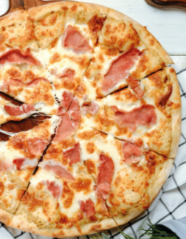 Pizza mediana 8 porciones. Ingredientes: pasta de tomate, extra queso, jamón, tocineta, ranchera y maíz.