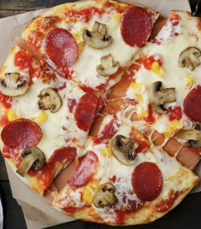 Pizza mediana 8 porciones. Ingredientes: pasta de tomate, extra queso, carne molida, champiñones y maíz.